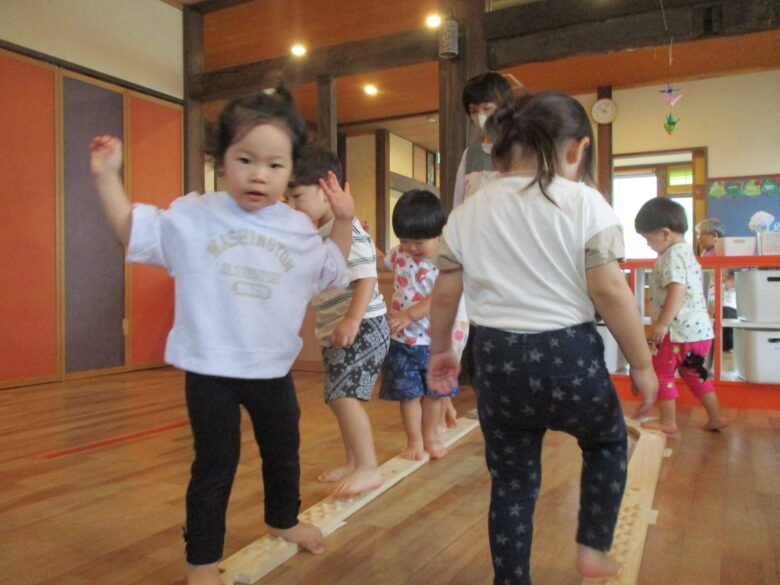 今日のくるみ組の活動では平均台をしました。平均台ではバランスを上手に取りながら楽しく遊びましたよ♪