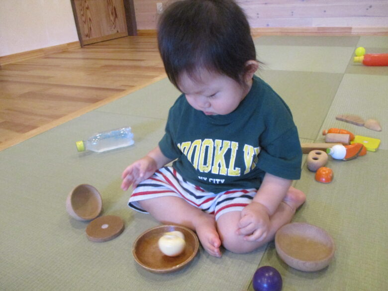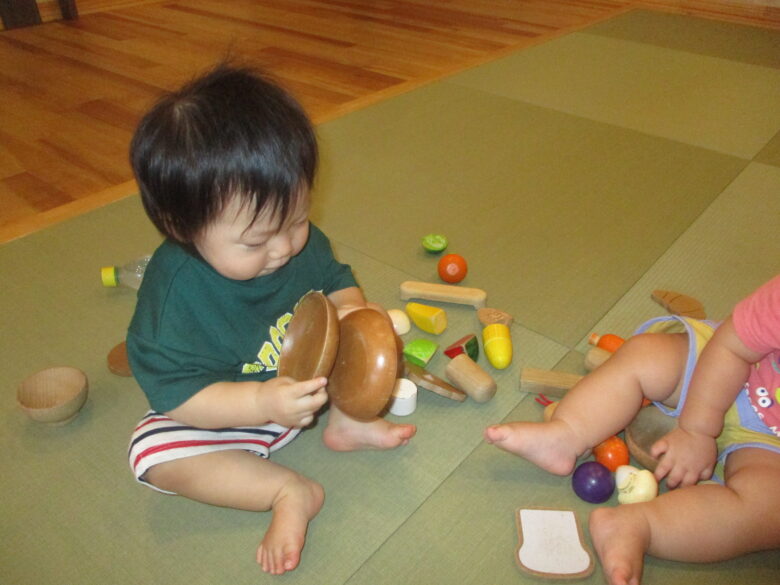 お皿を合わせて音も楽しんでいます。「カチカチ」いい音するねと言うと笑顔にっこりでした。