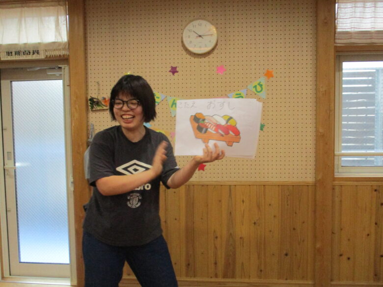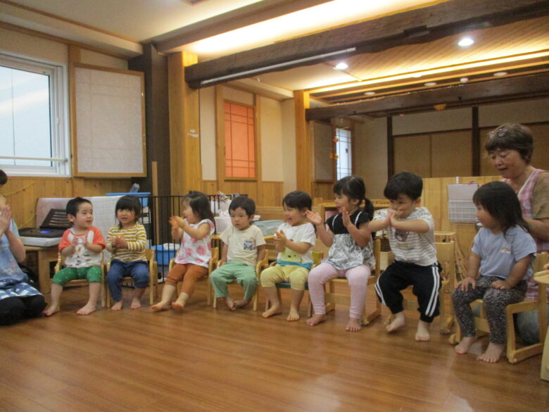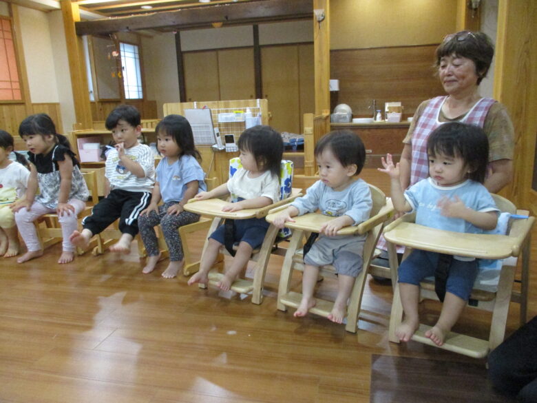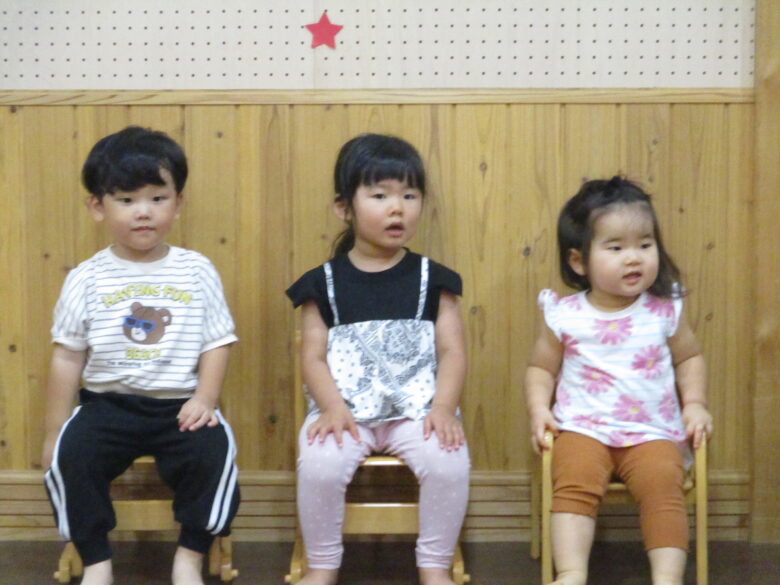 本日 9月生まれの お友だちのお誕生会を行いました。 朝か「今日、おたんじょうび~♪」と嬉しそうに教えてくれる姿が見られました。 保育者からのプレゼントは、クイズです。 担当の先生の好きな物をヒントをたよりに当てていくと、最後にはケーキの登場です。 皆、手を伸ばしてムシャムシャ♪と食べる真似をして楽しんでおりました。