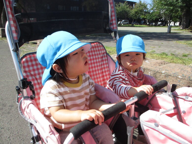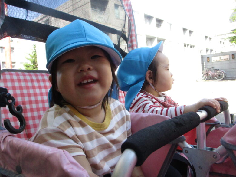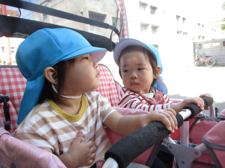 散歩車では、二人仲良く座って周りの景色を楽しんでいます🎶
