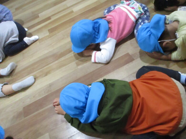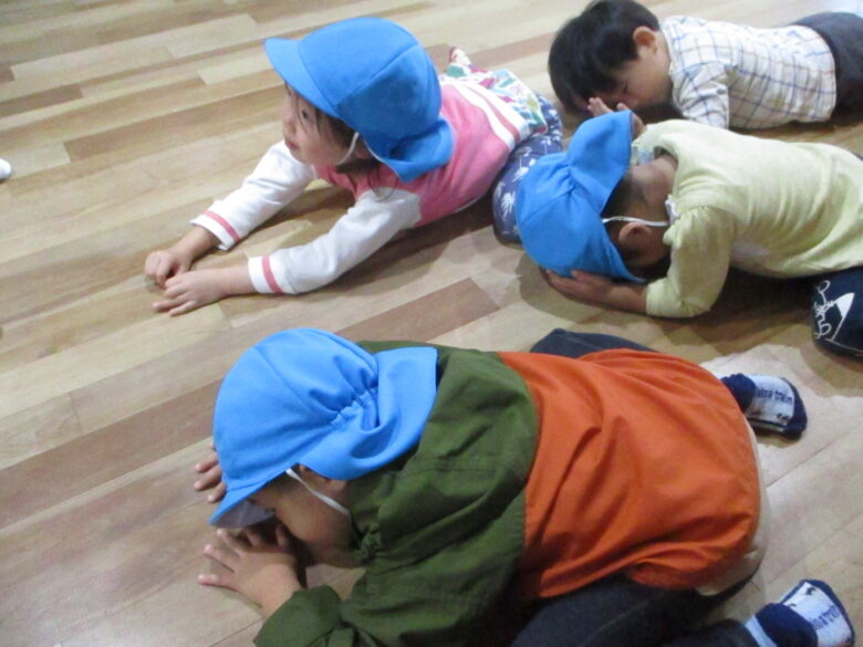 地震が来た時に天井や棚から何か物が落ちて来た時に、大事な頭を守る為に、【ダンゴムシ】のポーズして、体を小さく丸めています。