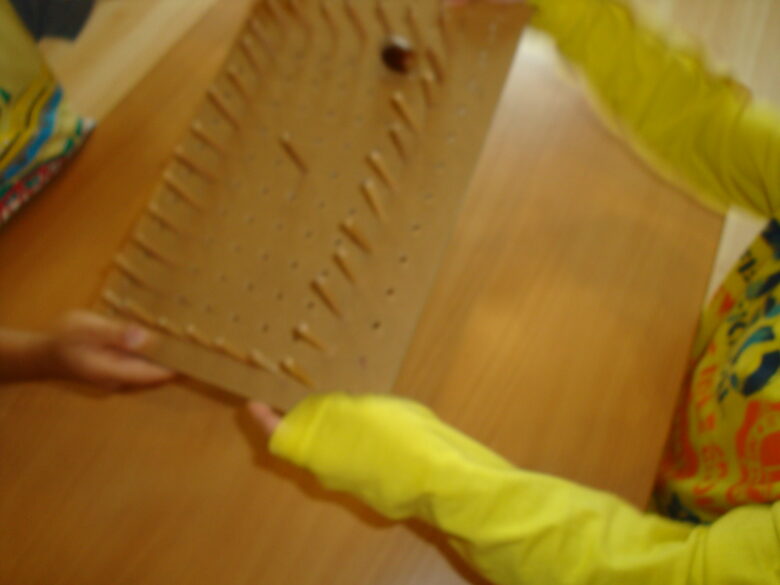 短い棒をさして、どんぐりの道を作っていました・・