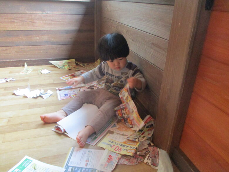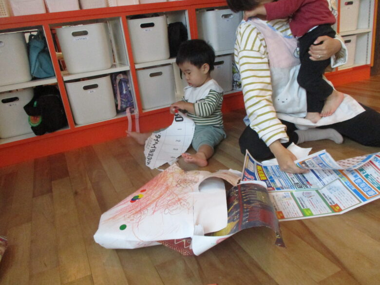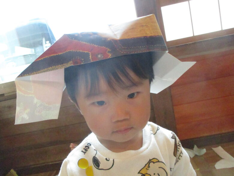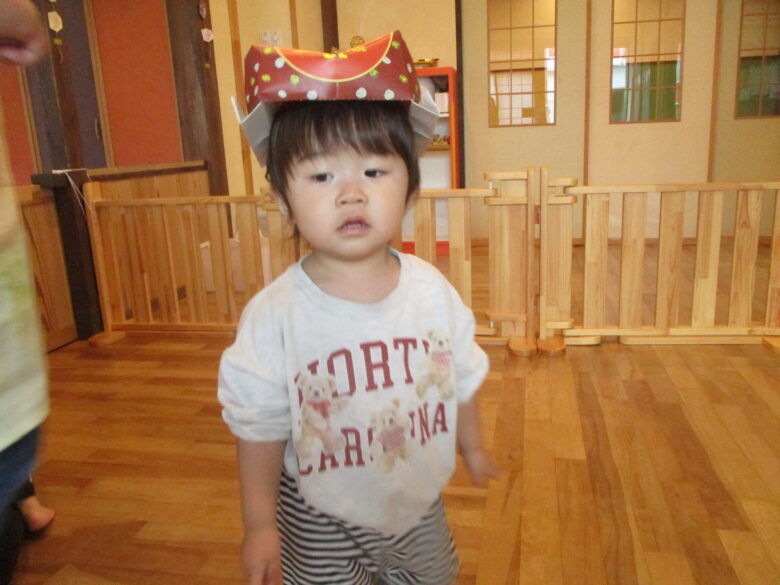 今日は室内活動で、保育士がチラシで帽子等を作ると自分から手に取って被っている姿がありましたよ♪ 他の子はビリビリにちぎって、丸めて、投げて楽しむ姿もありましたよ♪