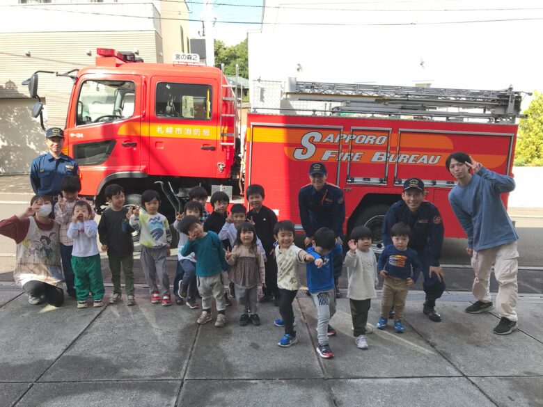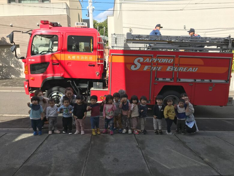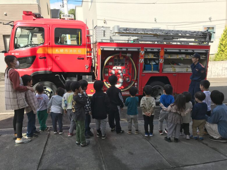幼児クラスは消防車の中も見せてもらい、説明をしてもらいました!