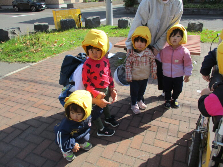 10月17日 避難訓練を行いました。 戸外遊び準備中に「地震だ!集まって!」の声かけに、驚いてしまう子も居ましたが、スムーズに室内の保育者の周りに集まり、頭を守る『亀のポーズ』をとっていました。 その後は、防災頭巾をしっかりと被り、頭を守りながら落ち着いて公園へ避難することができました。 園では月に1度、必ず避難訓練を行い、いざという時に園児の命を守れるよう努めております。 来月は不審者訓練の予定です。