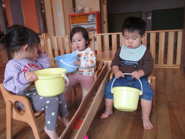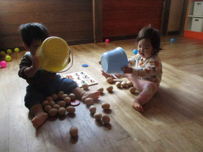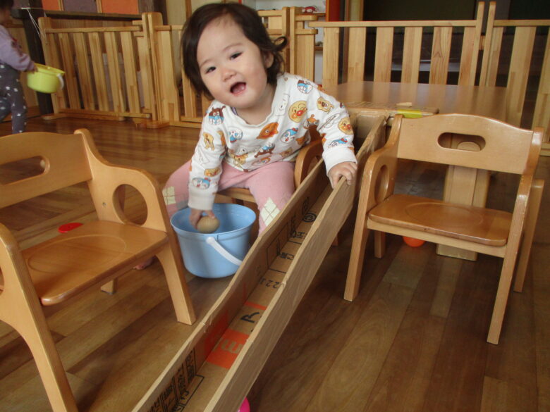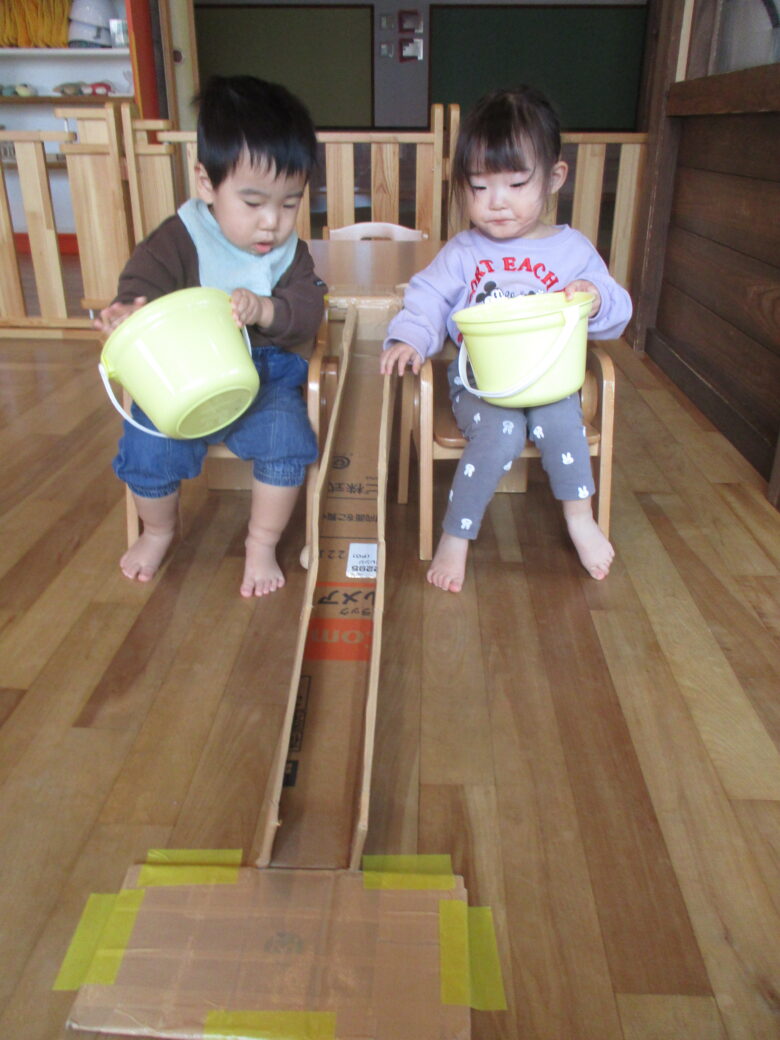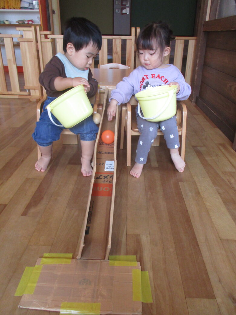 段ボールで作ったレールの上を木の卵やカラーボールなど様々な物を転がして遊びました。「いくよー」と言ってるかのように次々と転がして楽しそうな姿がみられましたよ!時々「どうぞ」とお友達にボールを渡す姿が見られましたよ。