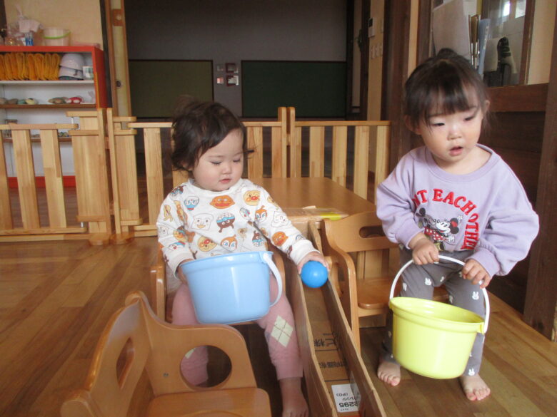 バケツに沢山卵を入れたり出したりも楽しんでいました。