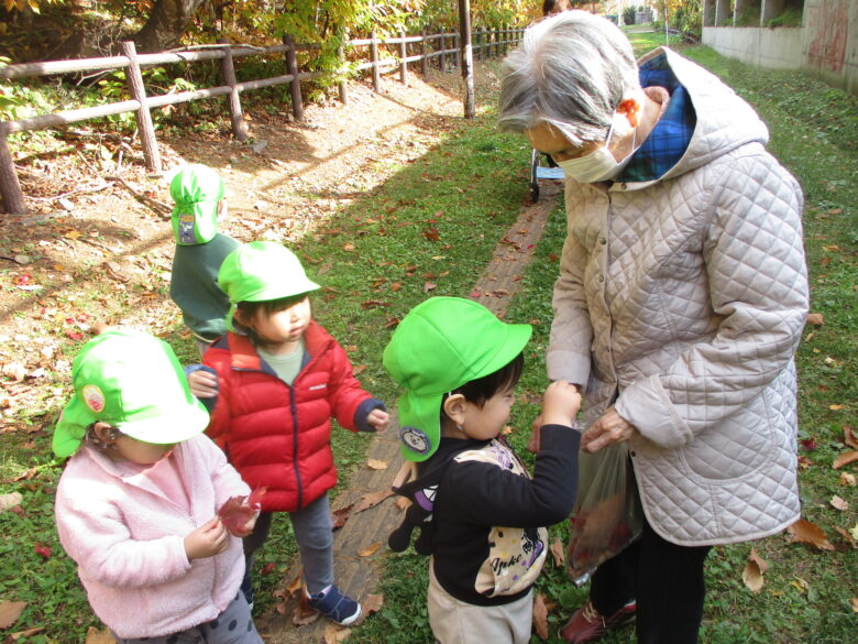 無垢の家の利用者の方1名とどんぐりや松ぼっくりを拾い、袋に入れたり、拾った物を利用者の方に渡していましたよ!!