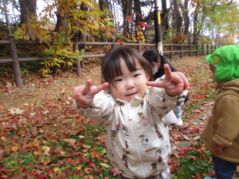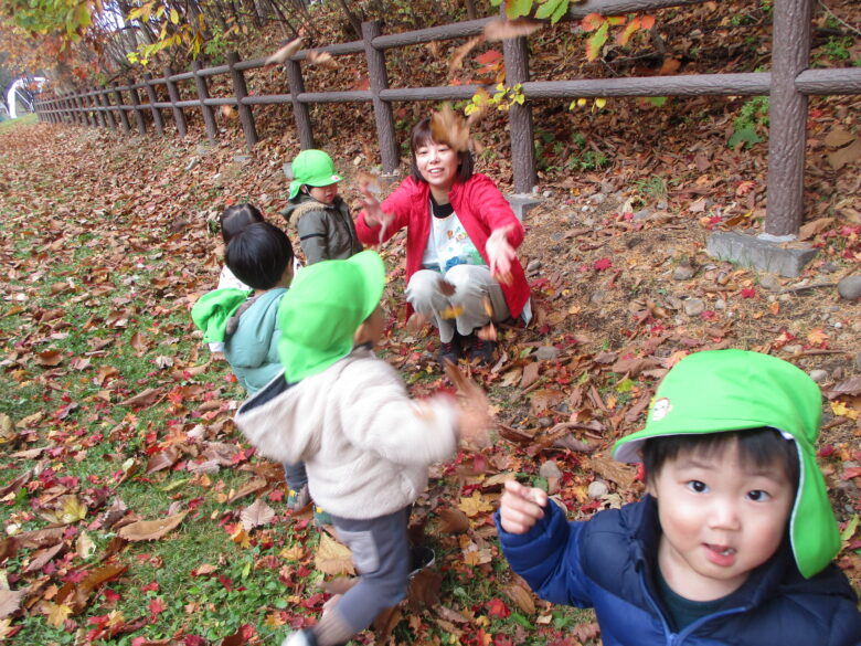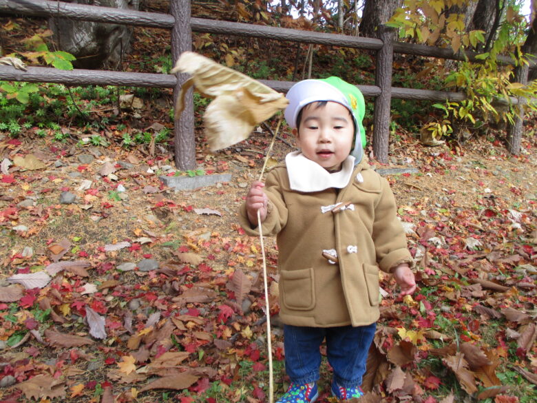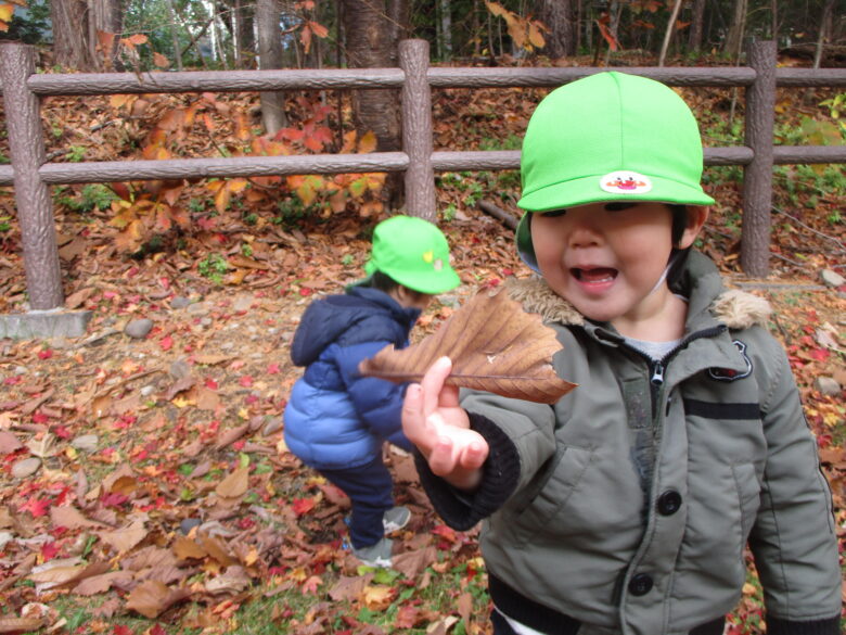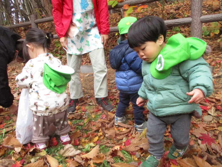 木育活動に使う落ち葉を拾いに行きましたよ♪ 袋を持つお手伝いしてくれたり、落ち葉を拾って喜んで保育士に見せてくれる姿がありました♪
