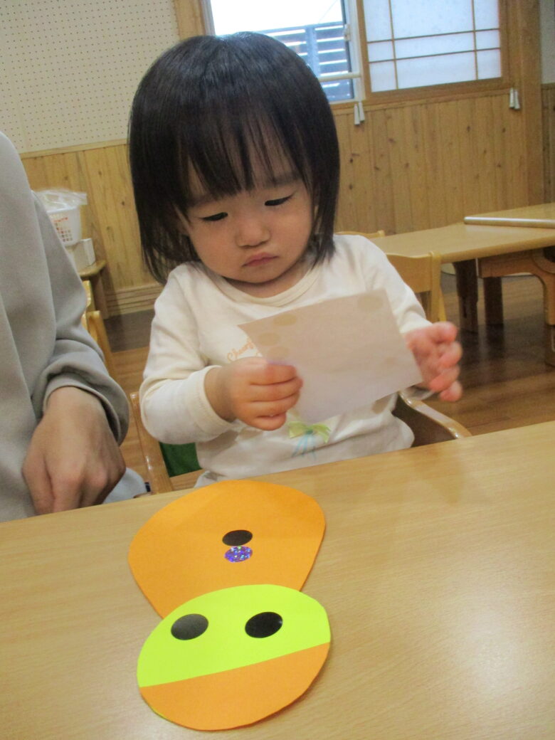 乾燥させた落ち葉の感触に、おっかなびっくりの0歳児さんでしたが、保育者と一緒に触れて制作を行いました。