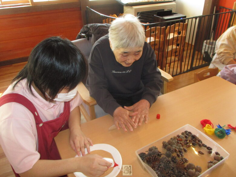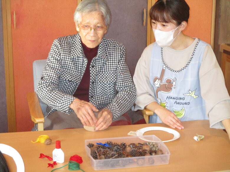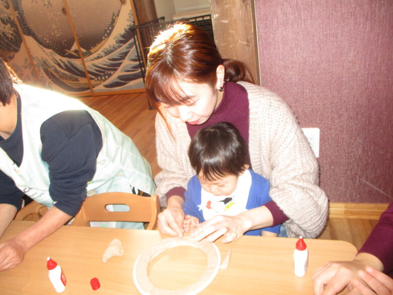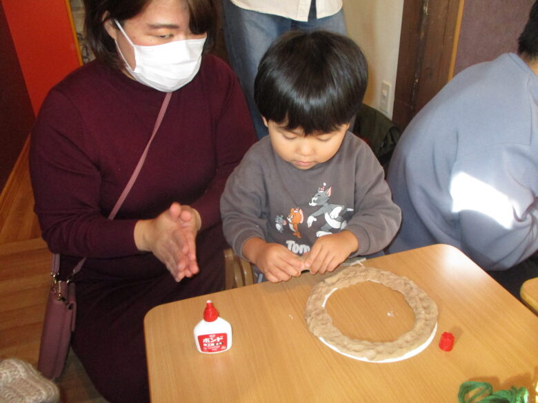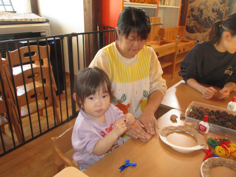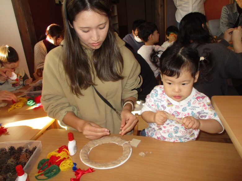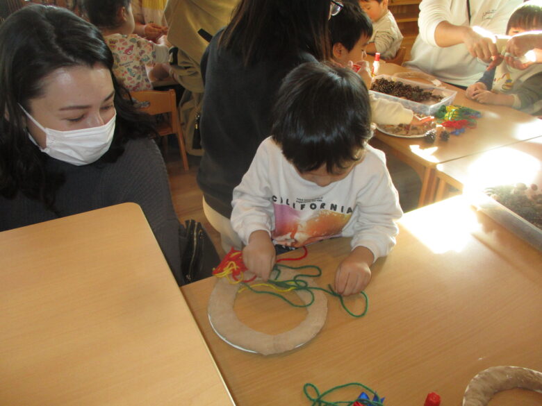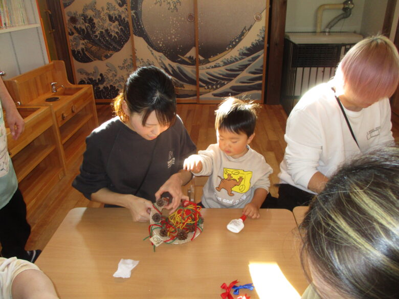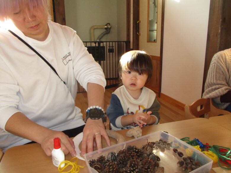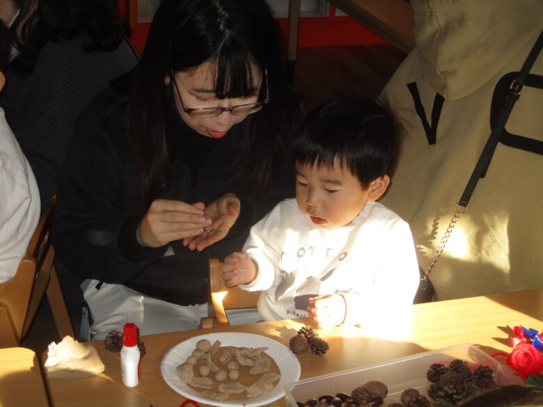 松ぼっくりや、どんぐり、くるみを使って親子で試行錯誤しながら作っています。