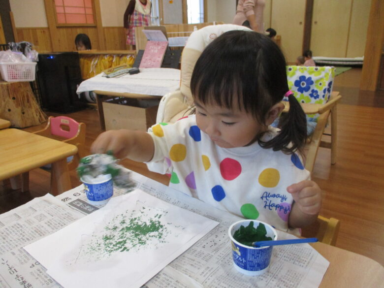 くるみぐみ(2歳児)さんは、画用紙・新聞紙・絵具・折り紙・糊・シール・ハサミを使用して制作を行います。
