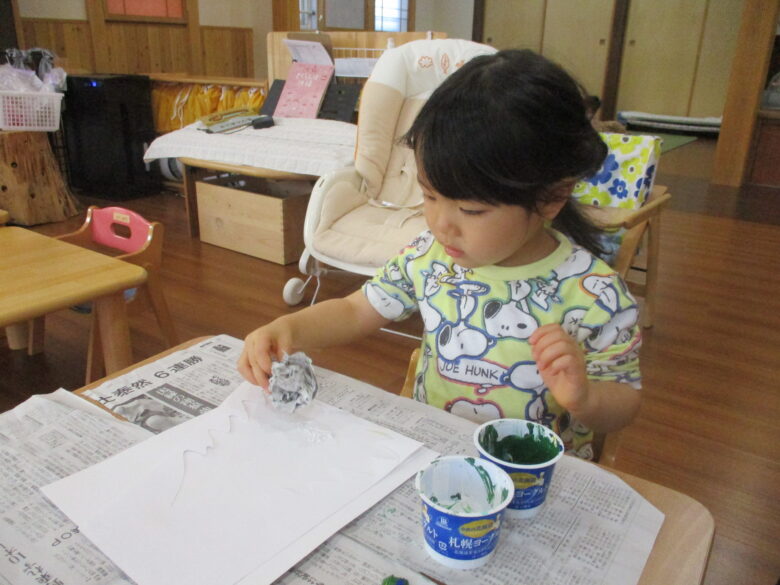 新聞紙に絵の具を付けてポンポン♪すると、あら不思議!!!