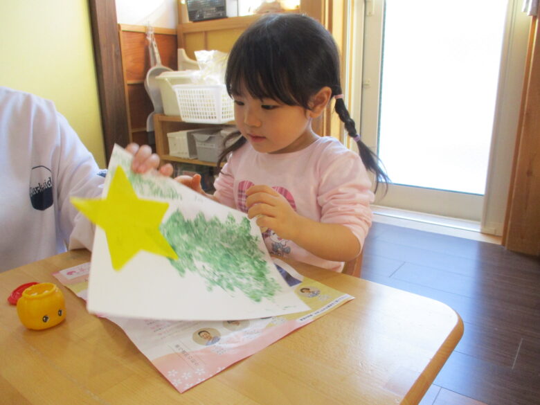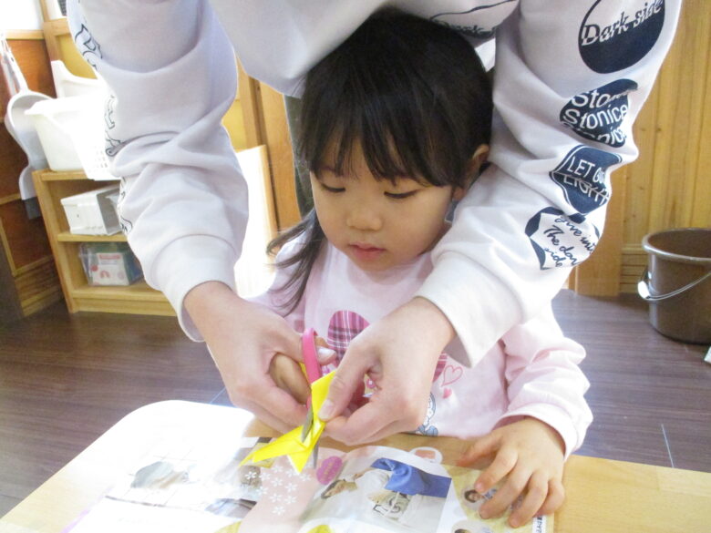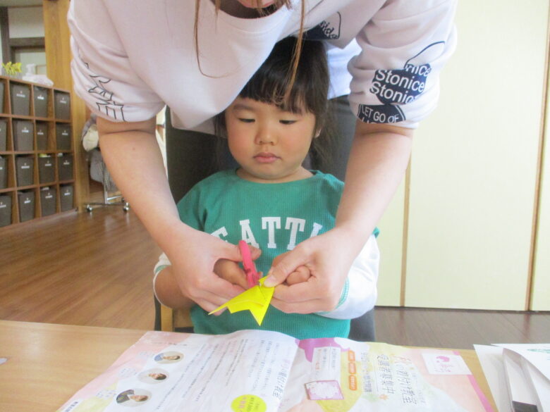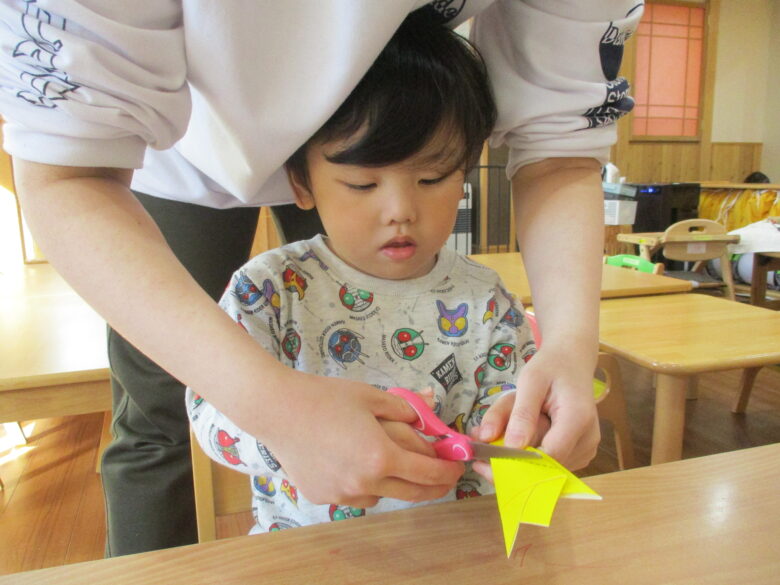 折り紙に引いた線の部分をハサミで切って、ゆ~っくりと開いてみると星☆の形になったのを見て「わぁ~♪」と声をあげながらも、不思議そうにしていました。