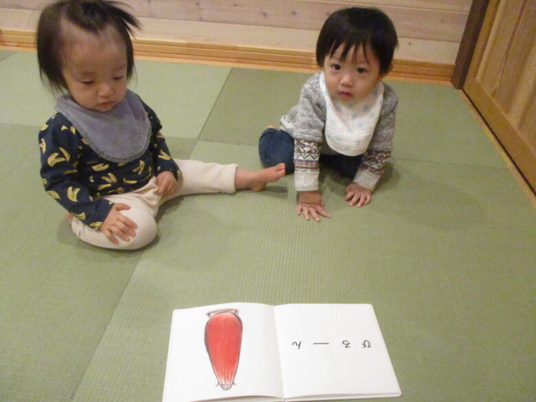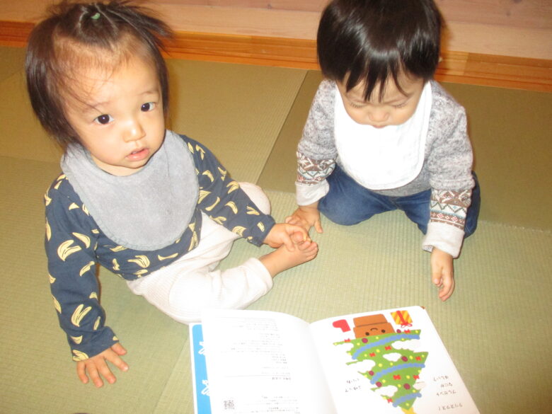 絵本タイムでは興味持って見ていましたよ!読んだ本は「だるまさんが」と「ふゆといえば」です。