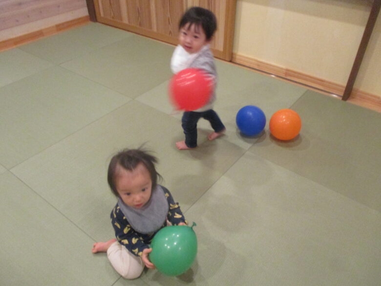 風船遊びではさっそく上手に投げては追いかけてとっても楽しそうでしたよ。