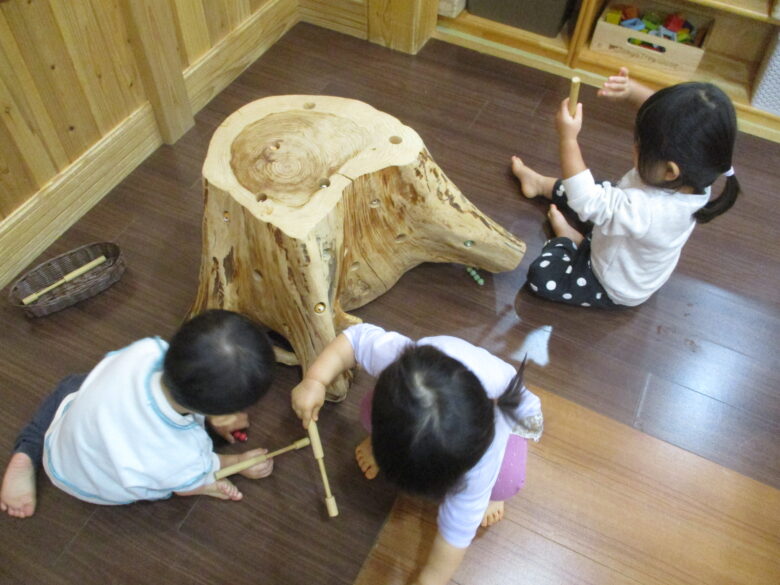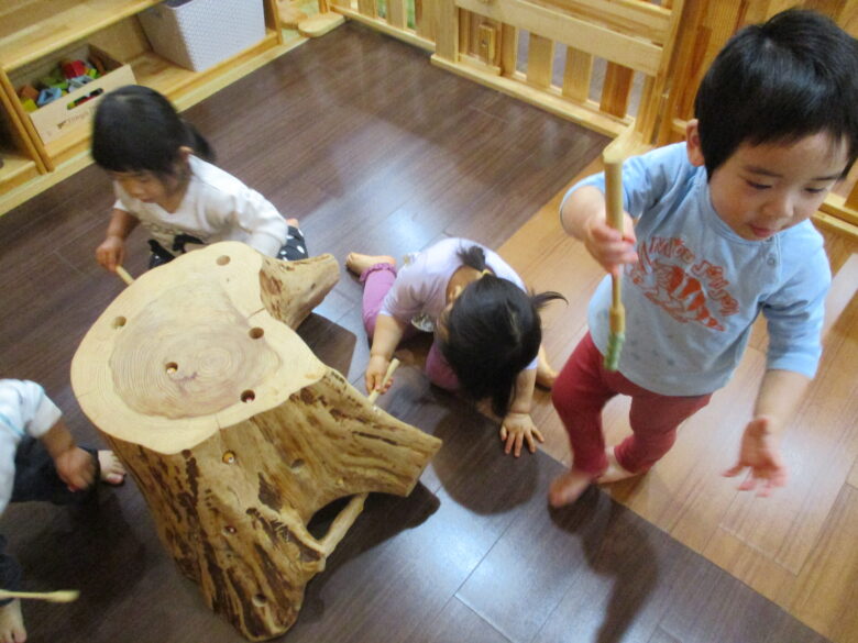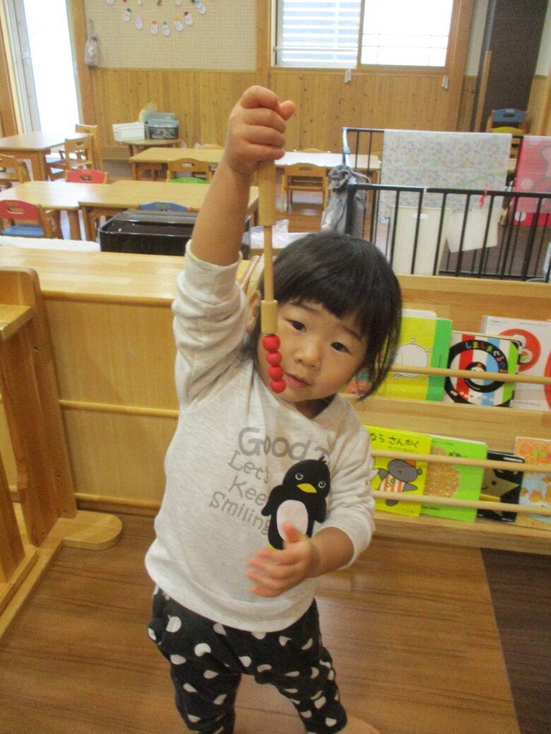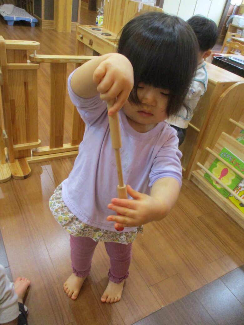 穴に隠れたむしをそっとひっぱり出す感触がくせになる、この木の玩具は、皆、大好きな玩具です。 3色の、ひっつきむしを磁石棒で出して楽しんでいます。 いくつもひっぱり出して、片手に持ちながら他のひっつきむしを狙う子、1匹出したら1度戻して次のひっつきむしを狙う子、様々です。 切り株を生かした玩具です。自然を感じながら遊んでいますよ!