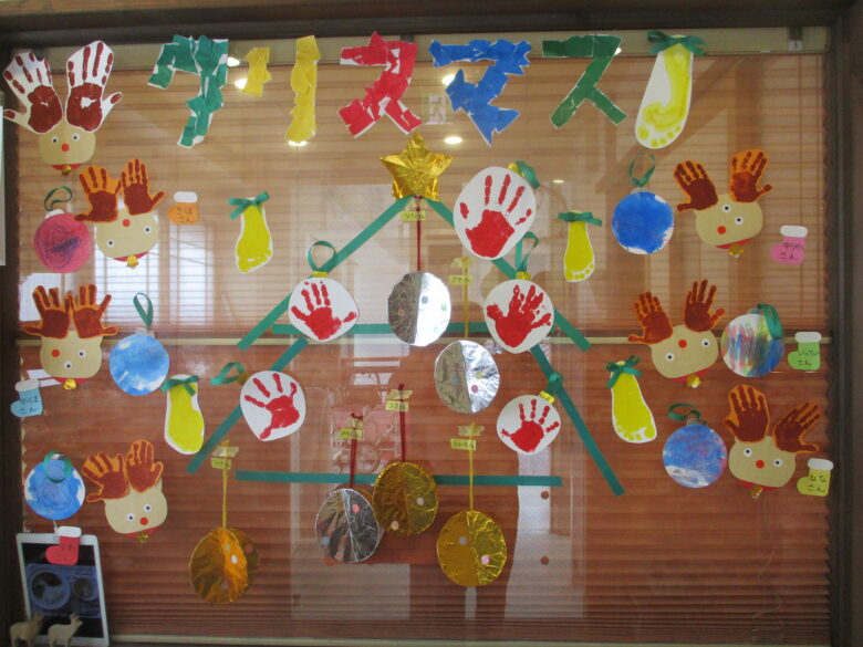 クリスマス会を行いました。 あけみ先生トナカイさんの先導で登場したサンタクロースは、なんと!しゅん先生でした。 いつも優しく皆を見守る眼差しは、やはり・・・🎅 手遊びをしたり、クリスマスのスケッチブックシアターを観て、楽しい時間となりました。 最後にクリスマスプレゼントを貰って、嬉しそうな子どもたちでした。 今日と明日は、玄関は子どもたちの手作りオーナメントを飾っております。 今回も『クリスマス』の文字は、くるみぐみ(2歳児)さんの制作です♪ 送迎の際に是非、ご覧ください。