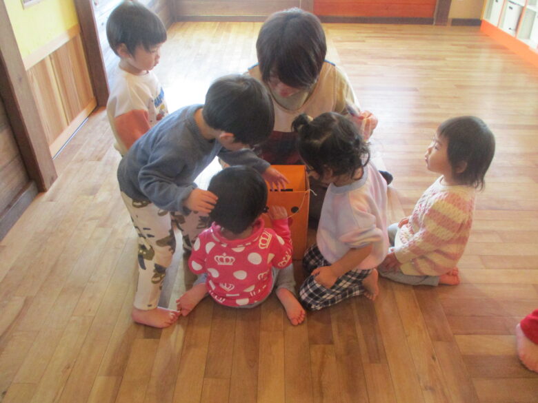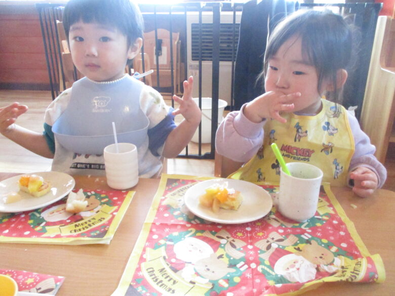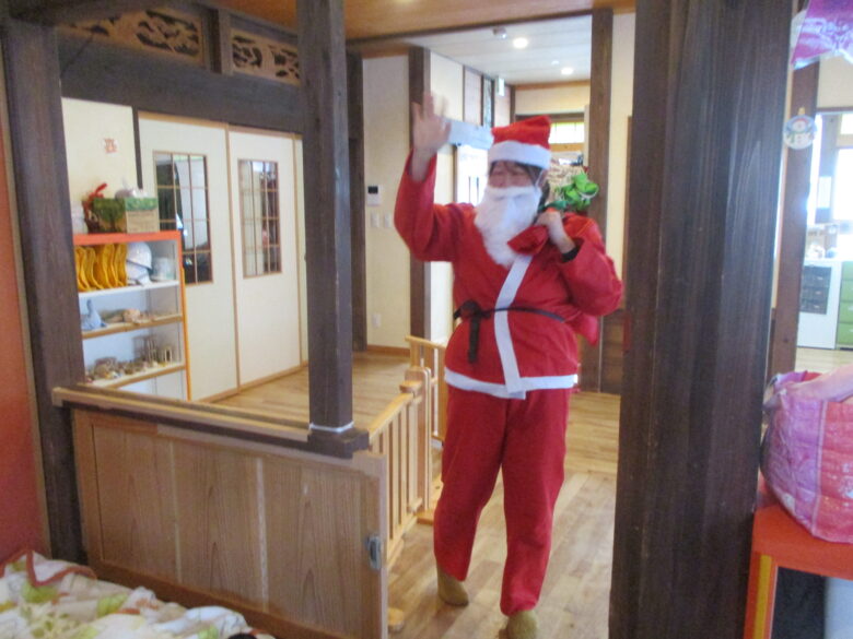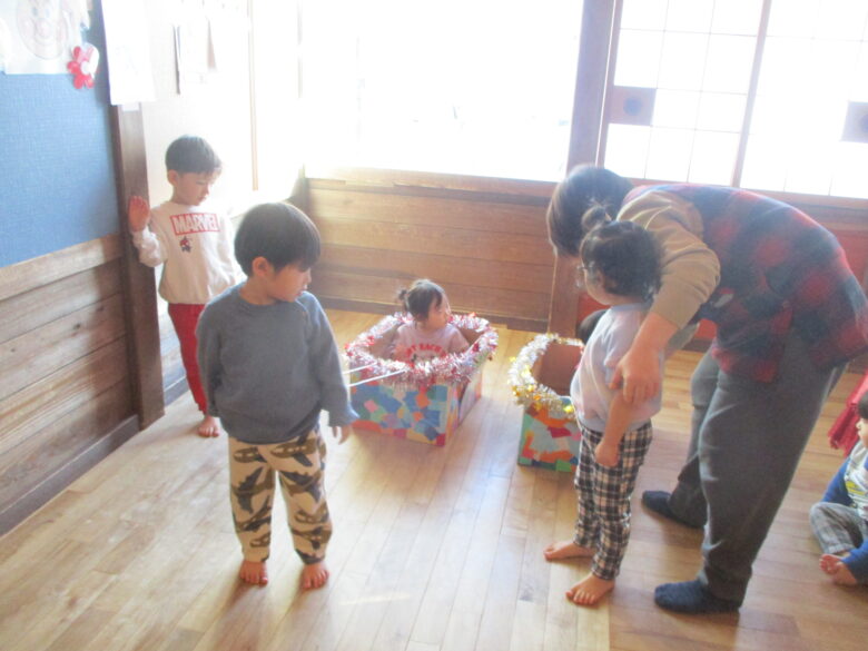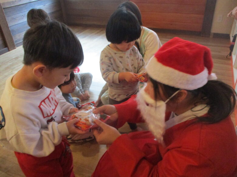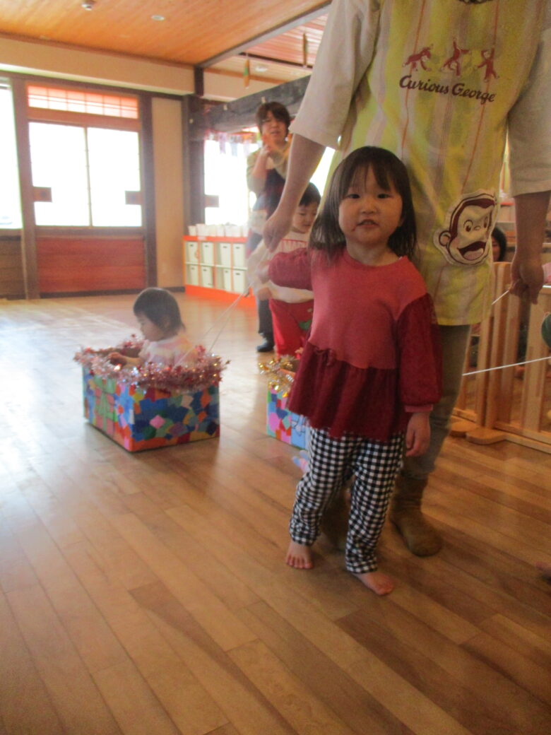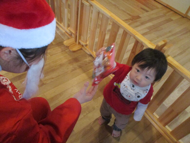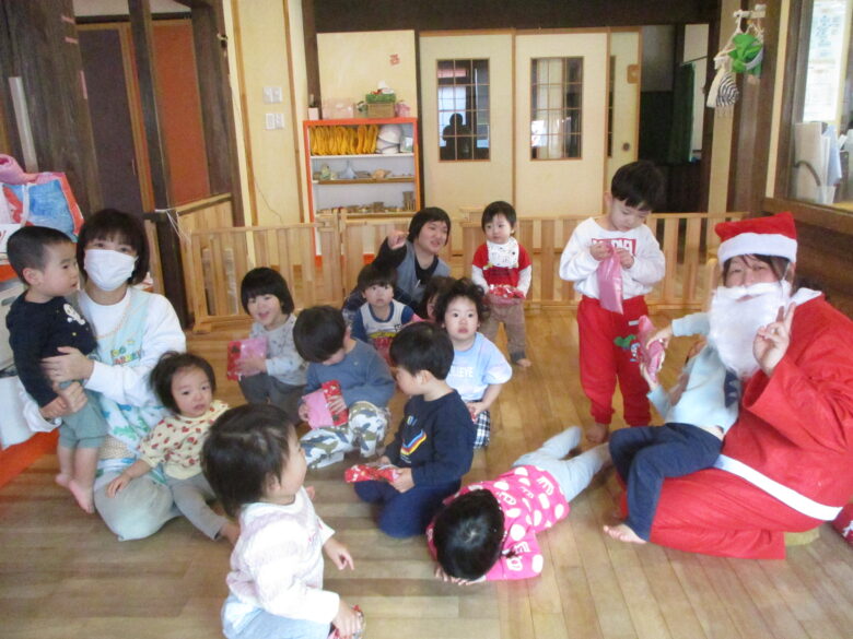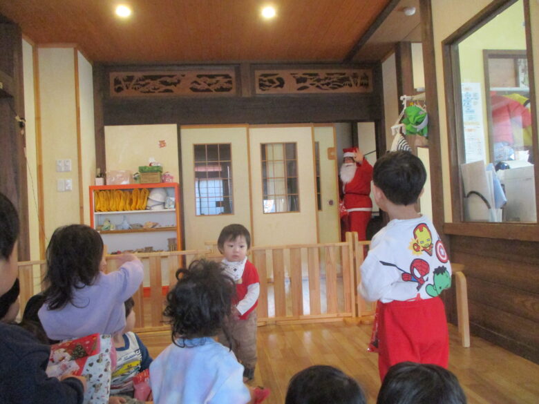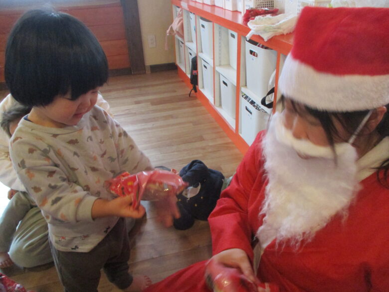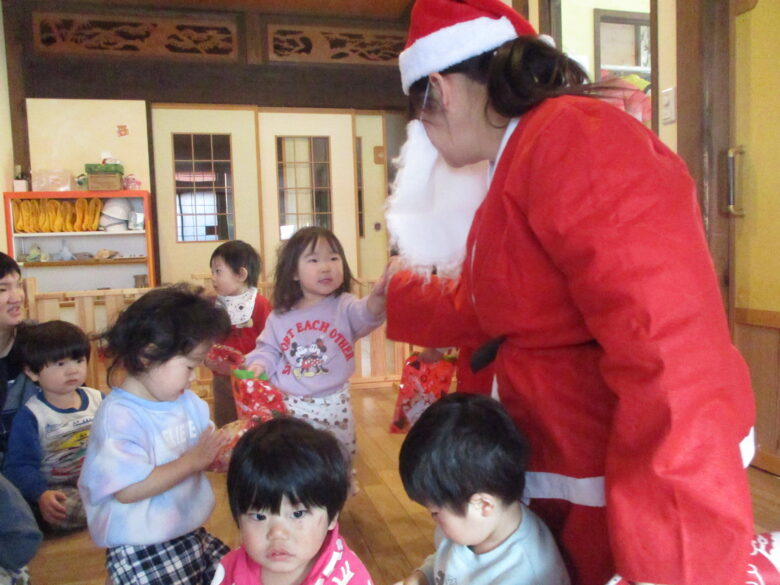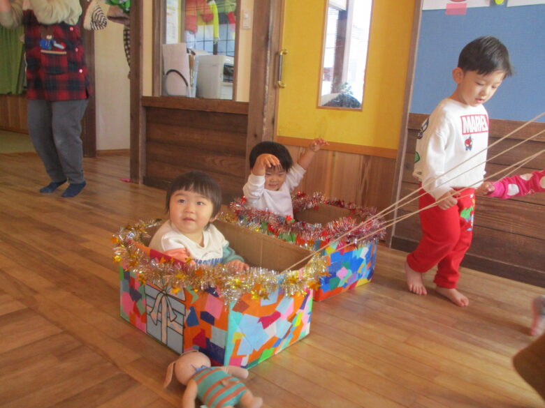 12月24日にクリスマス会を行いました。サンタとトナカイになりきりプレゼントを取りに行き運ぶのを楽しみました。