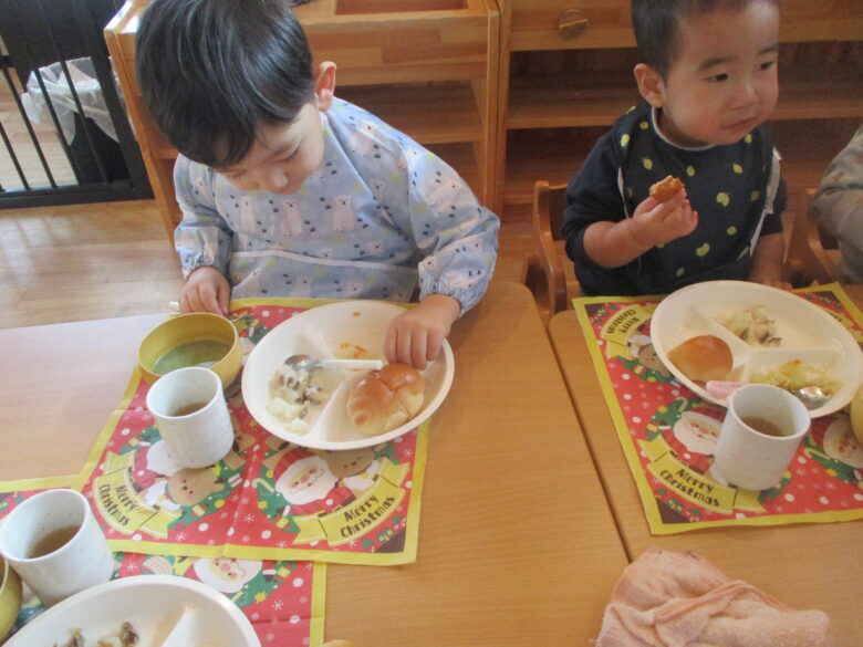 遊んだ後は給食タイム。美味しそうにみんな食べていましたよ。