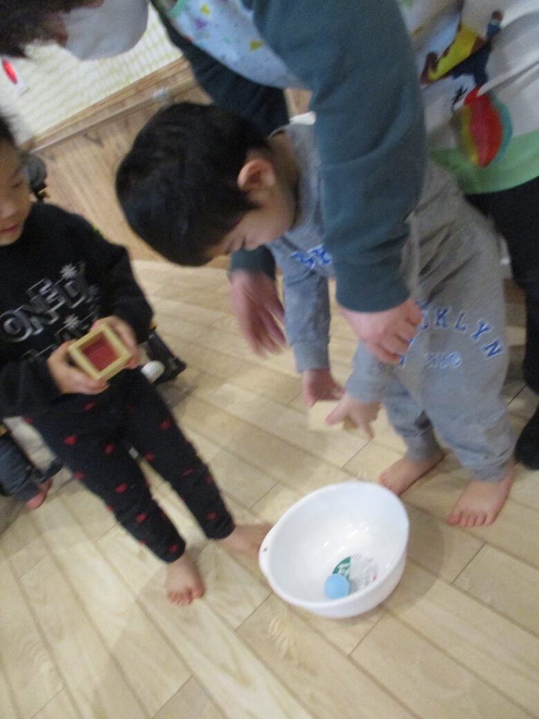 後半はみんなでピンポン玉お隣の人に升を使って渡し、2分間で何個運べるかをしました。
