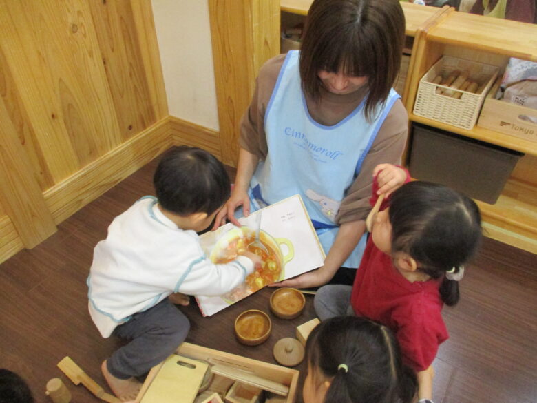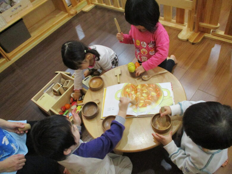 「ぐつぐつしてる」「これもいれよう」「まぜまぜして」「できてきたよ」とイメージを共有して、どんどんあそびが広がっていきます。