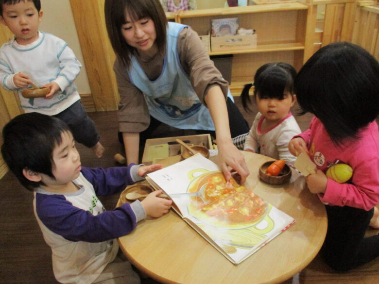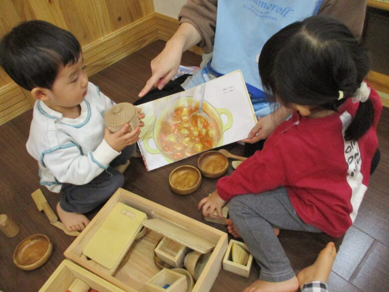 皆が大好きな『カレーライス』の絵本を観ながら、ままごとでカレーライスを作りました。