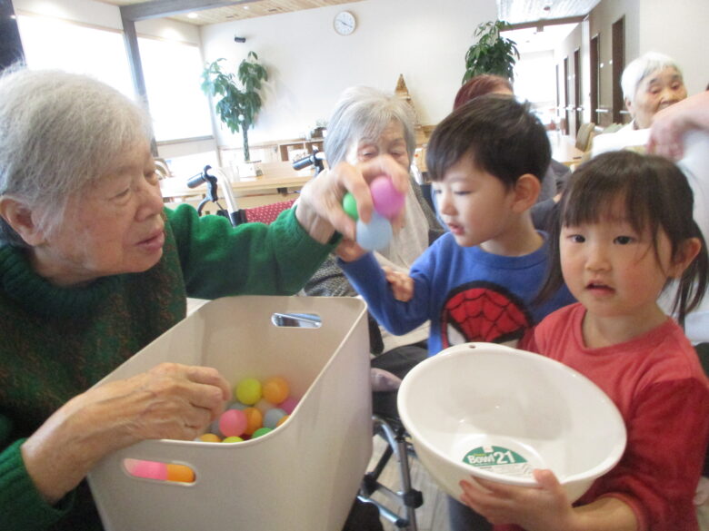 2チームに分かれ、ピンポン玉をボウルに入れるゲームをしましたが、前日に行った時よりみんな掴むのが上手になっていました!!