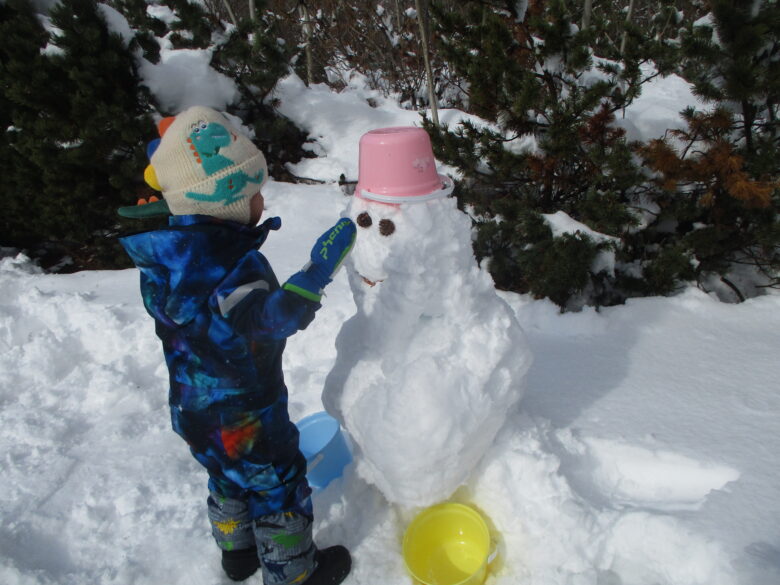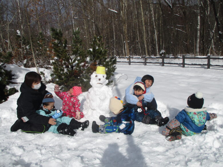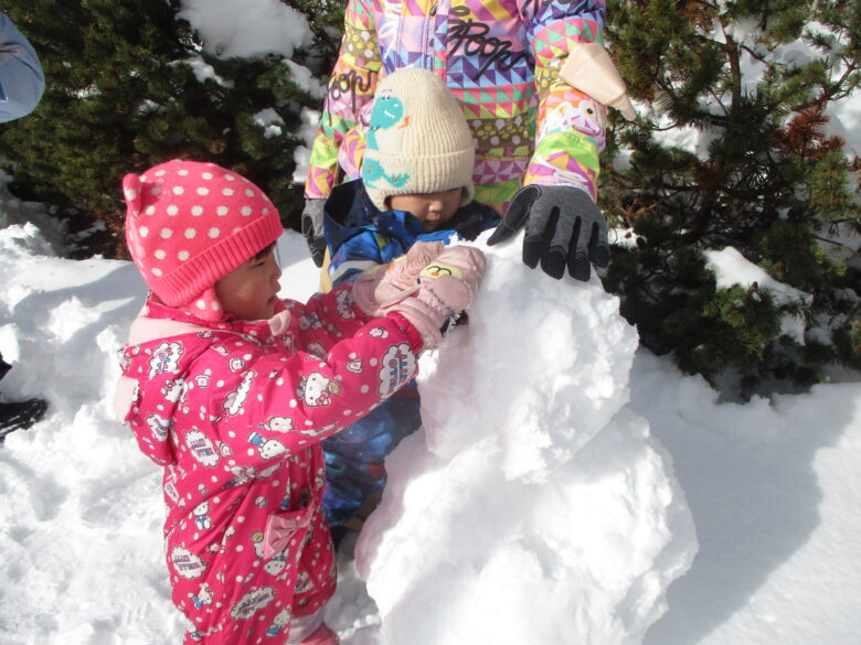 「ゆきだるまつくろう」と言うお友達の声に皆で大きい雪だるまを作る事にしました♪