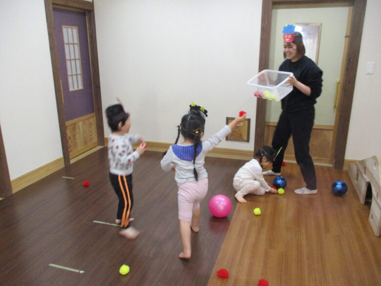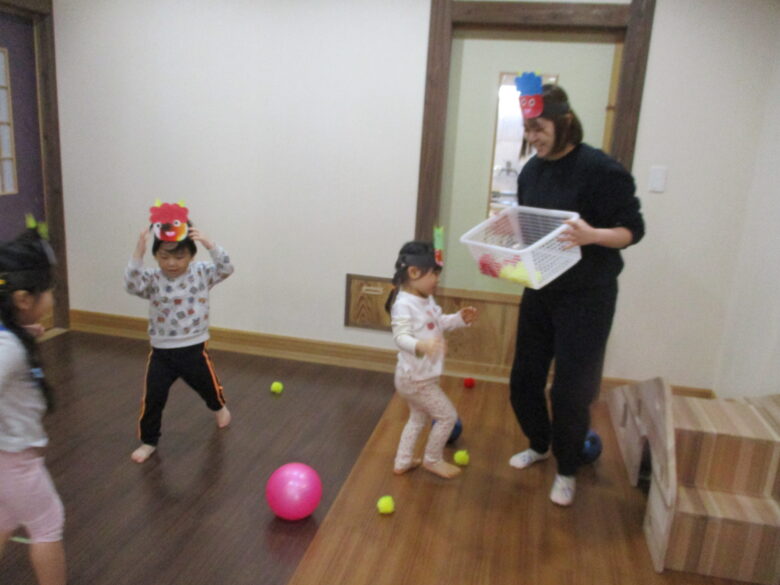 今年の節分は、クラスごとに行いました。 くるみぐみ(2歳児)さんは、担当保育士と『カゴに豆をたくさん入れようゲーム』を楽しんだ後に、各クラスを回りました。 「鬼だぞー」と言いながら行ってみると、どのクラスも鬼に大変身! くりさん(1歳児)と一緒に、今度は「鬼はそと~!」と鬼同士で豆を投げ合っておりました。