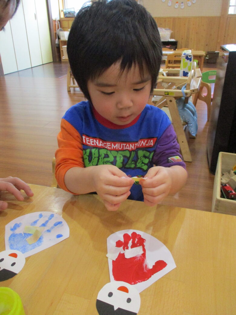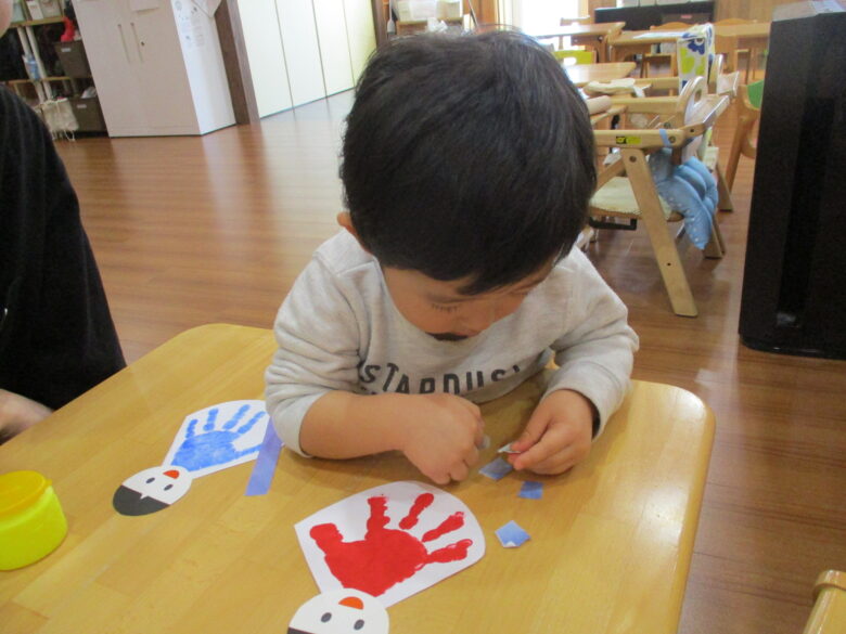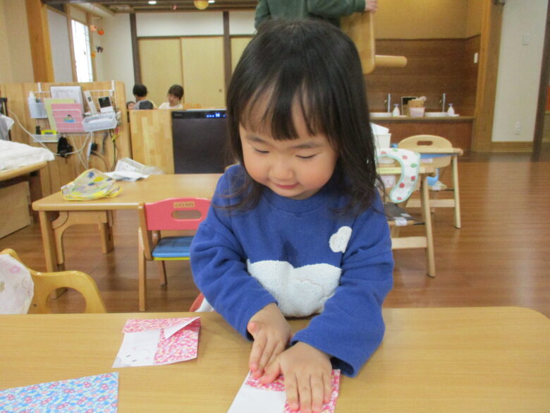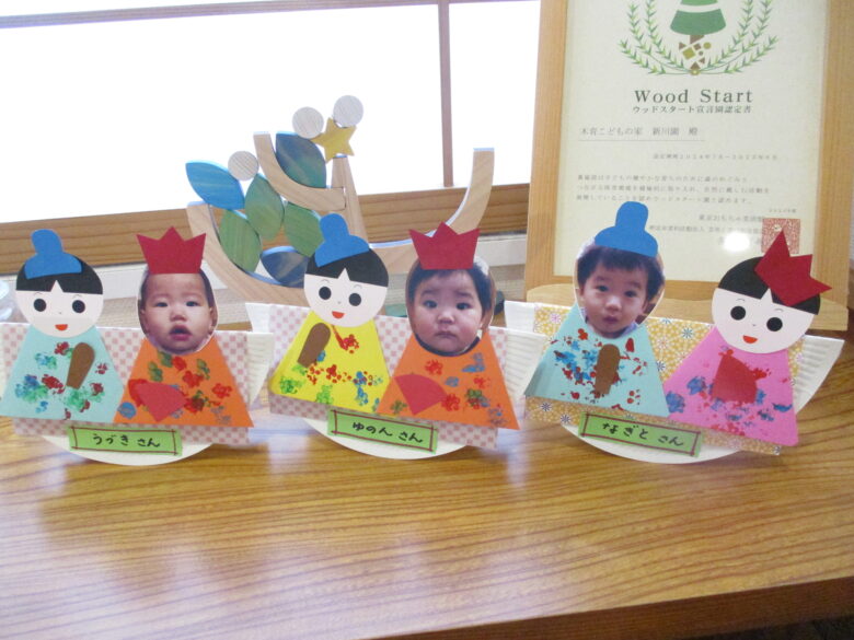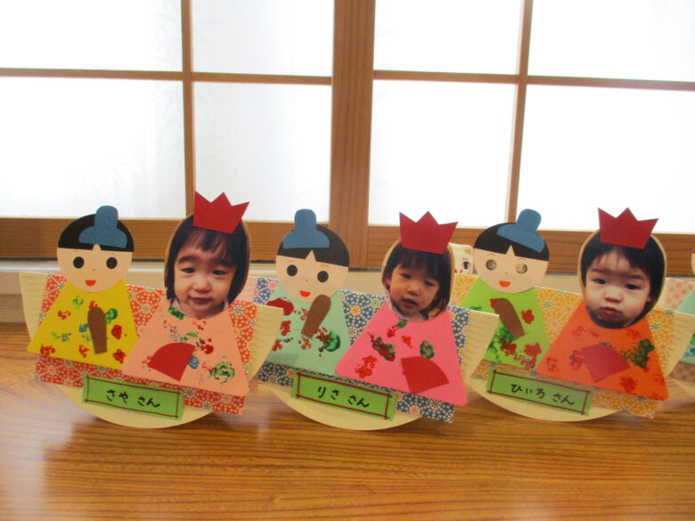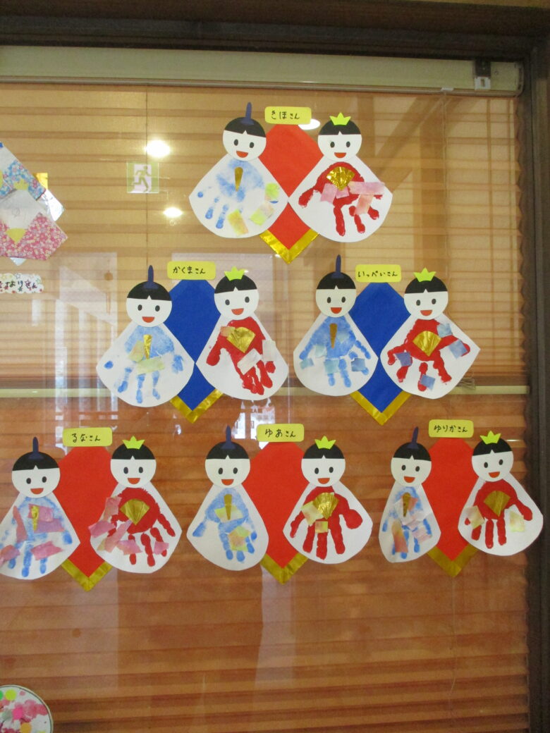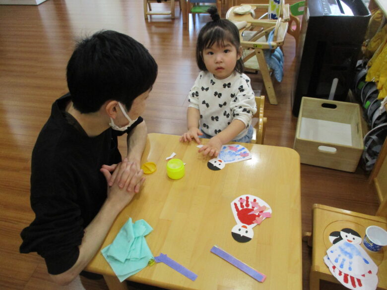 3月3日に向けて、各クラス ひな祭り制作を行ってきました。 折り紙やのり、手形やスタンプを使用して、可愛いお雛様の出来上がりです。 友だちや他クラスの作品に「かわいいね、上手だね」自分の作品には「のりで貼ったんだよ~」と教えてくれます。 小規模園での季節制作は、子どもと1対1でゆっくりと行えます。 様々な素材に触れて、指先の感覚、素材の感触を楽しんでいます。 登降園の際に是非ご覧ください。