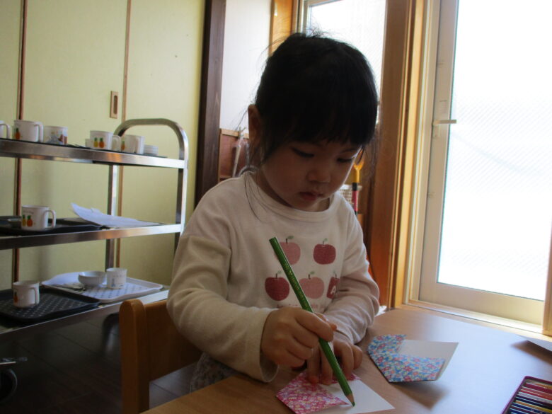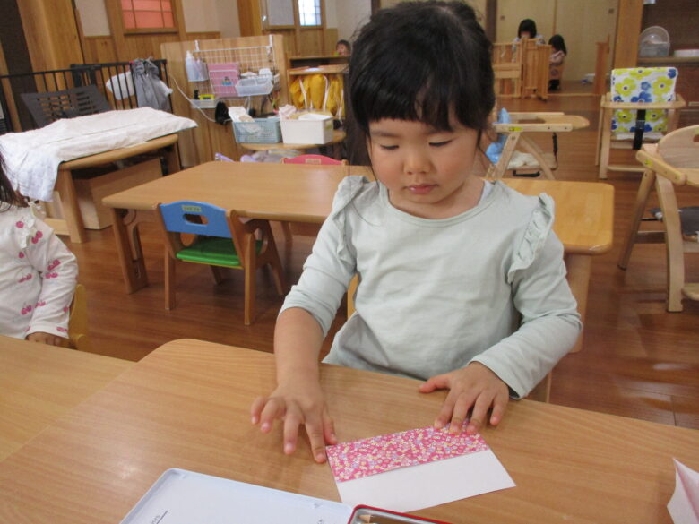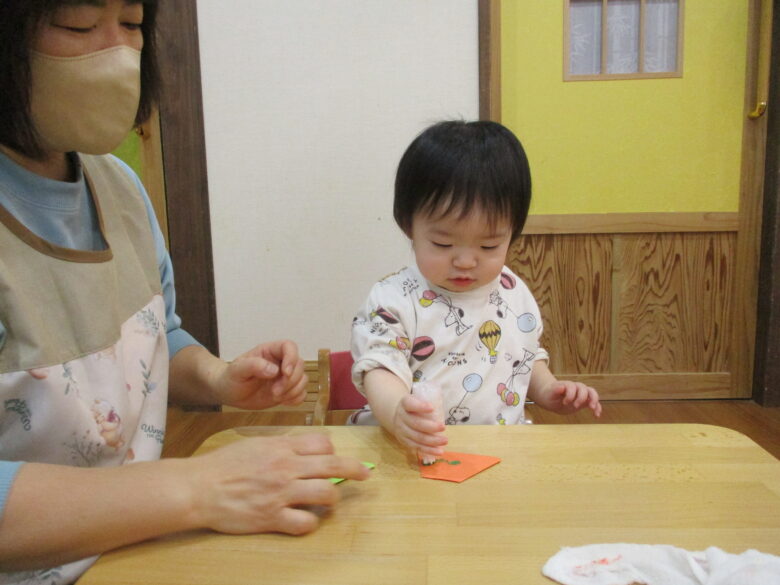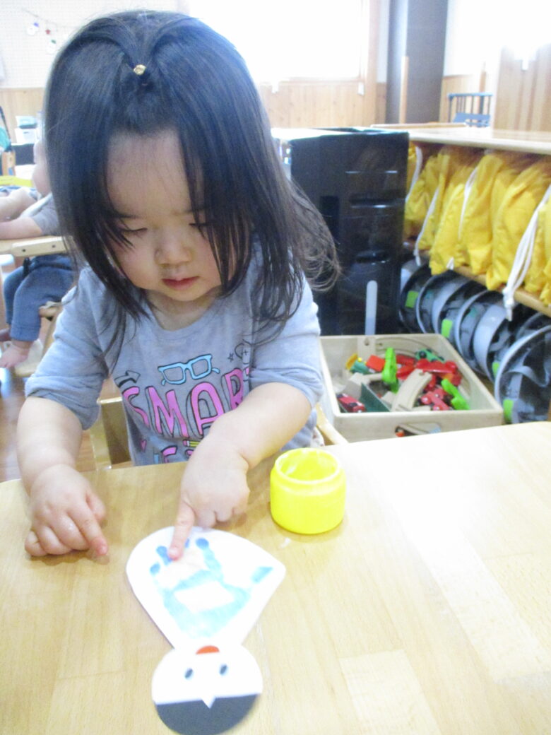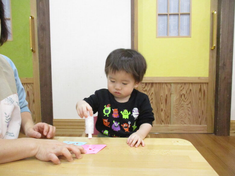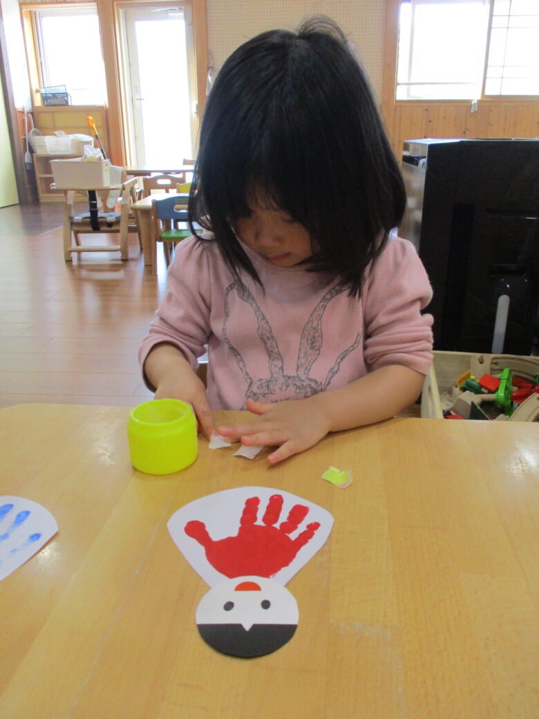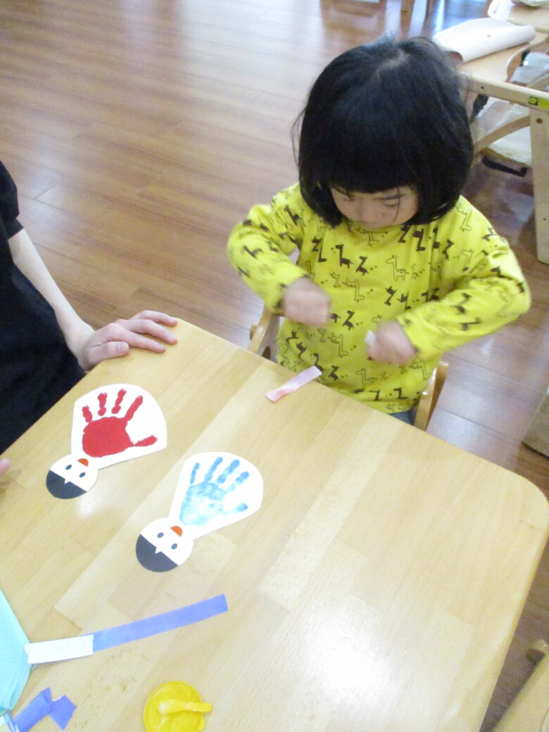 3月3日に向けて、各クラス ひな祭り制作を行ってきました。 折り紙やのり、手形やスタンプを使用して、可愛いお雛様の出来上がりです。 友だちや他クラスの作品に「かわいいね、上手だね」自分の作品には「のりで貼ったんだよ~」と教えてくれます。 小規模園での季節制作は、子どもと1対1でゆっくりと行えます。 様々な素材に触れて、指先の感覚、素材の感触を楽しんでいます。 登降園の際に是非ご覧ください。