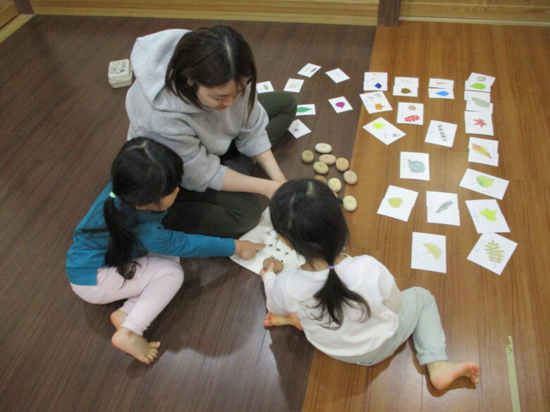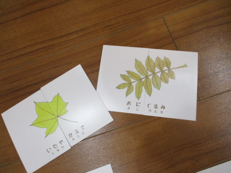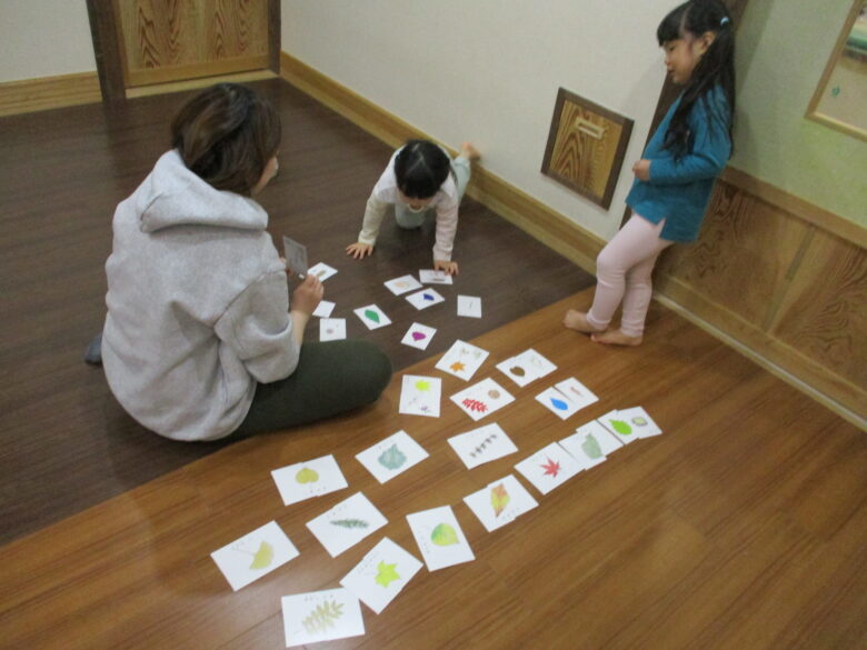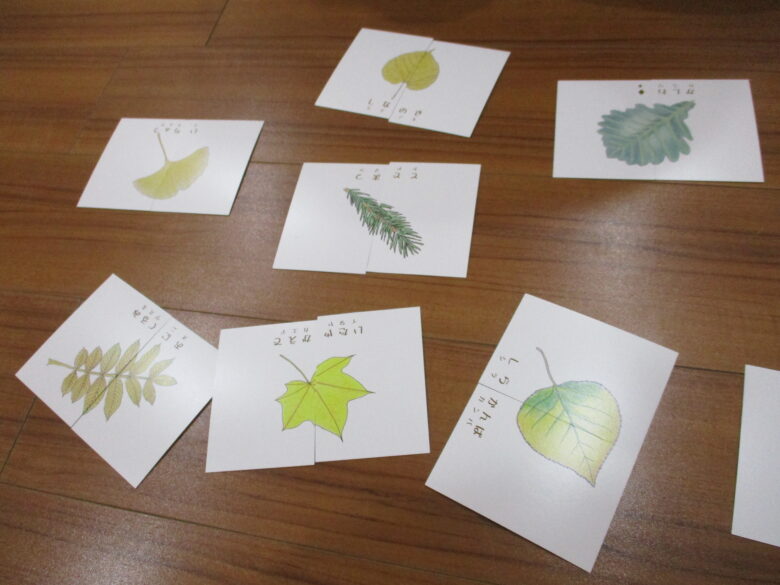 木育こどもの家新川園には『木の葉カード』や色々な木の素材でできている『まあるいつみき』があります。