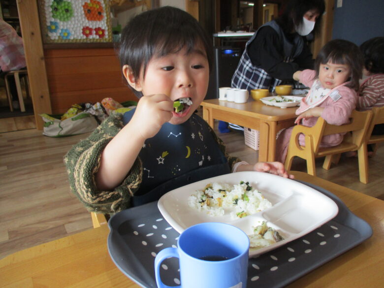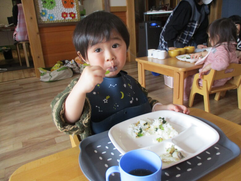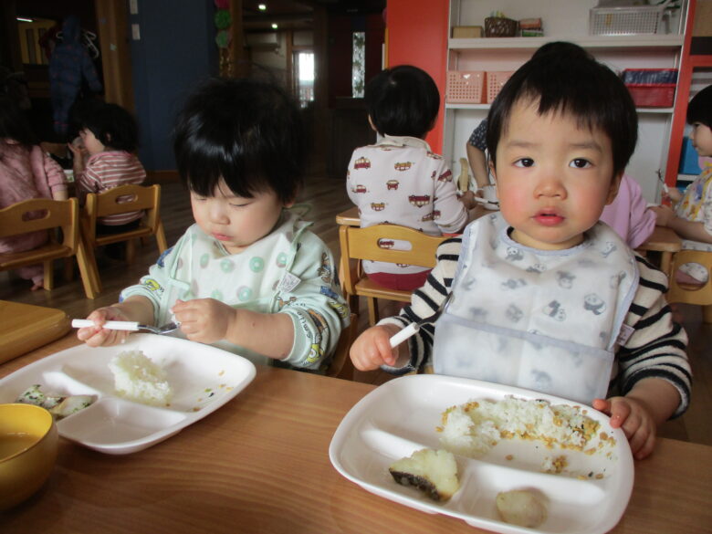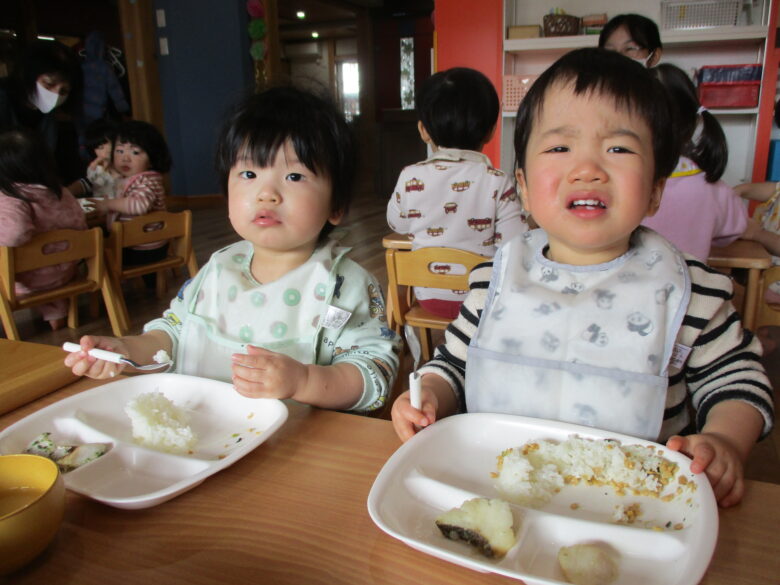 大きいお口素敵だね💗 今日はみんな自分で上手に食べることができました✨ 来月からは、くるみ組さんですね🌸元気に登園するのを待っているよ🍀