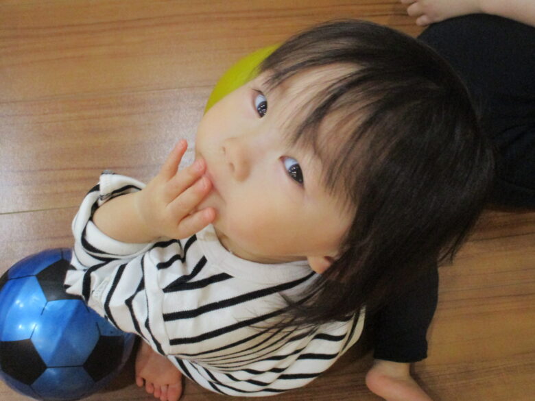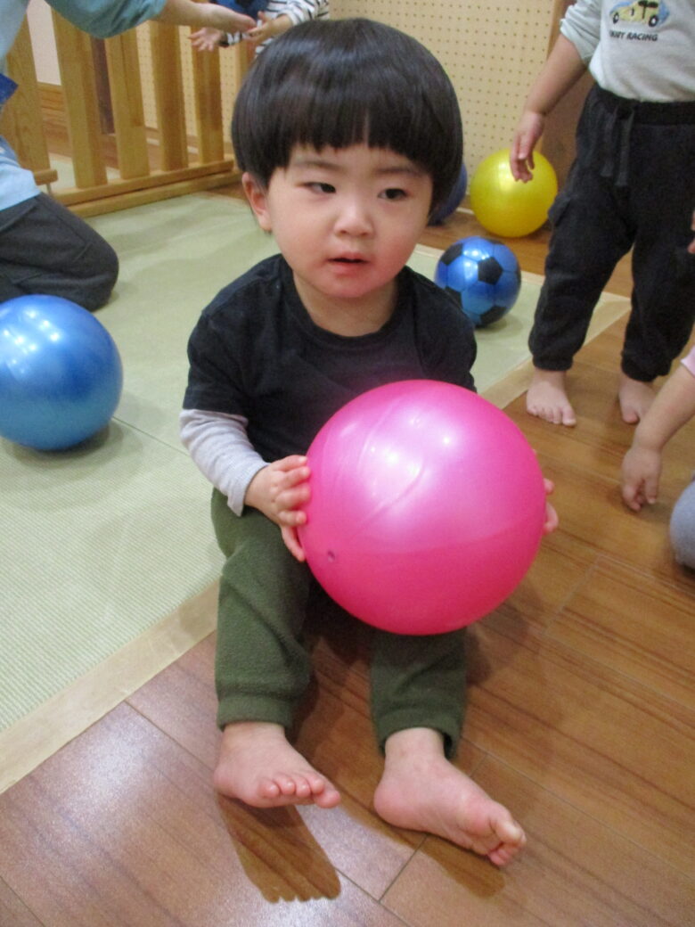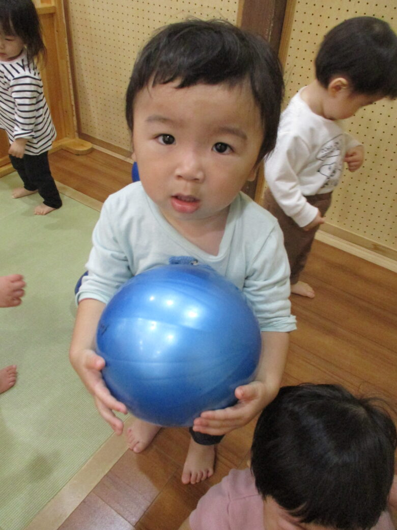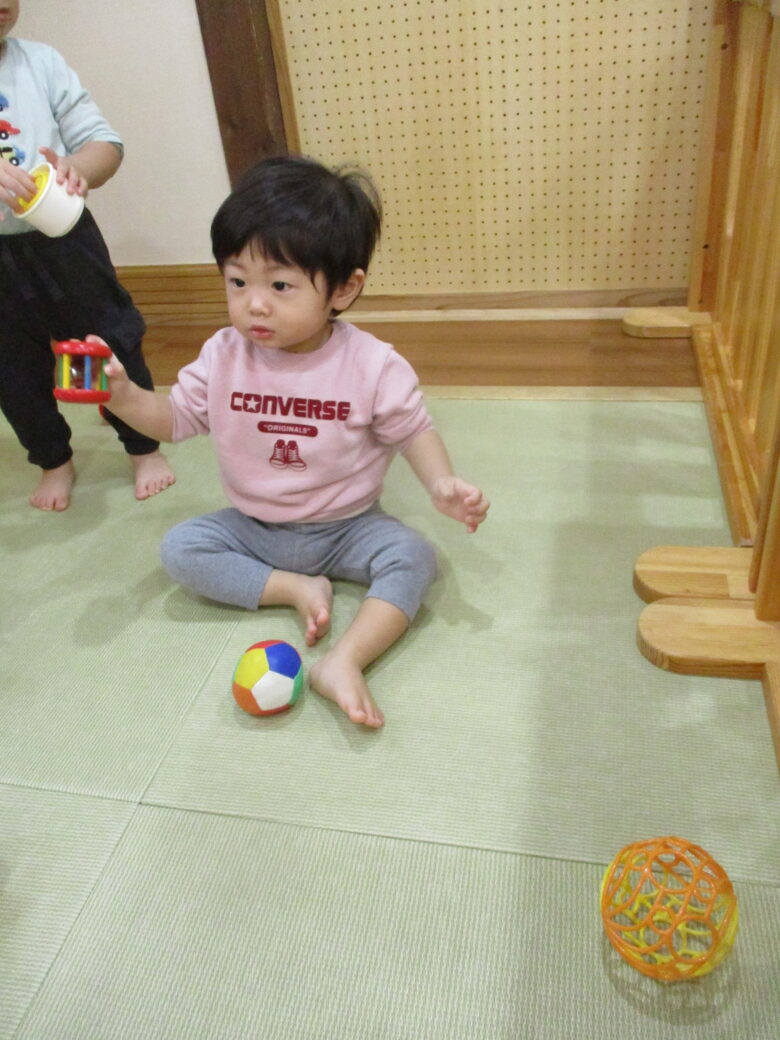 今日は、ボール遊びや気になる木の玩具を見つけて遊ぶ姿が見られます。