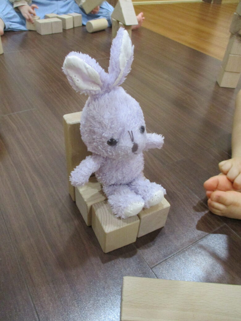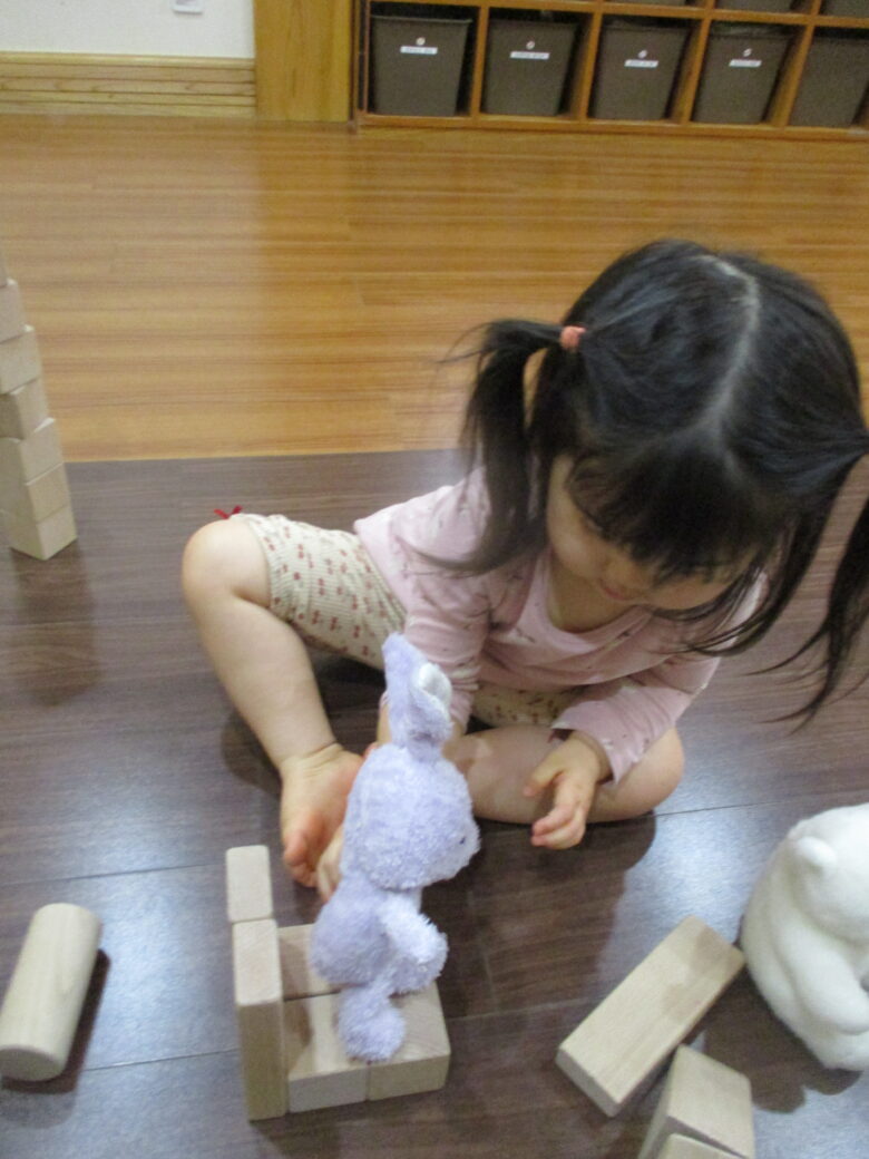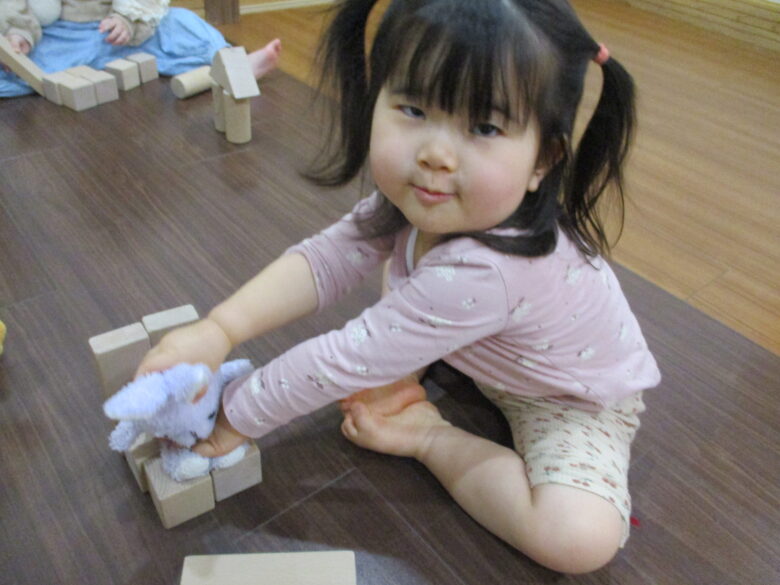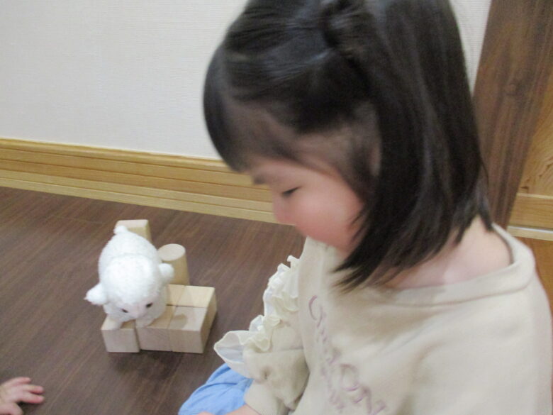 好きなぬいぐるみを選び、積み木で遊びました。 どうぞのイスの絵本をイメージして、うさぎさん🐰をイスに座らせようと一生懸命です♪ 三角の積み木を屋根に見立てて、ひつじさん🐑のお家を作っています。 三角の積み木を二つ並べて、滑り台に見立てて、ぺんぎんさん🐧を滑らせています。 どんどん想像力をふくらませて遊んでいます。 玩具を組み合わせて遊べるのは、くるみさんならではですね。