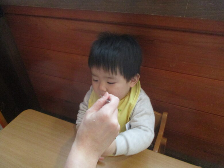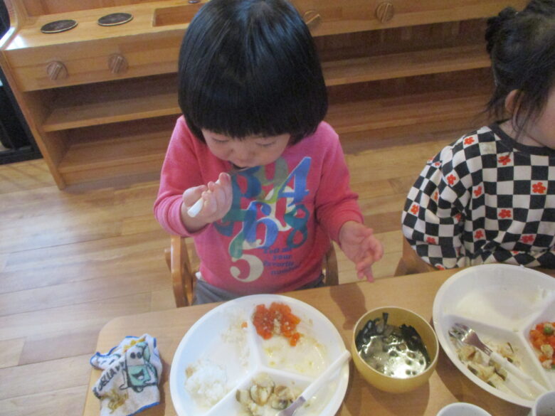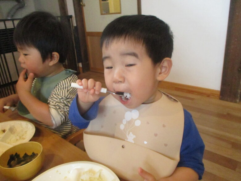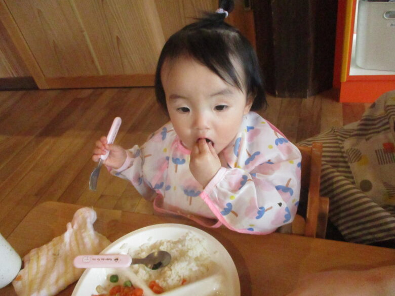 初めての保育園の給食も自ら手を使って食べたり、保育士に手伝ってもらいながら上手に食べていましたよ!