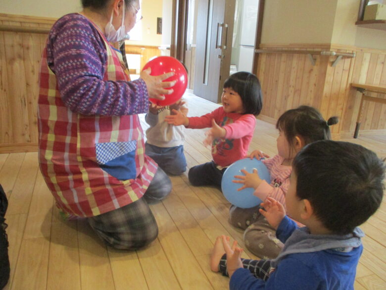 風船では、保育士が膨らませると「ちょうだい」と言い手を差し出しています。
