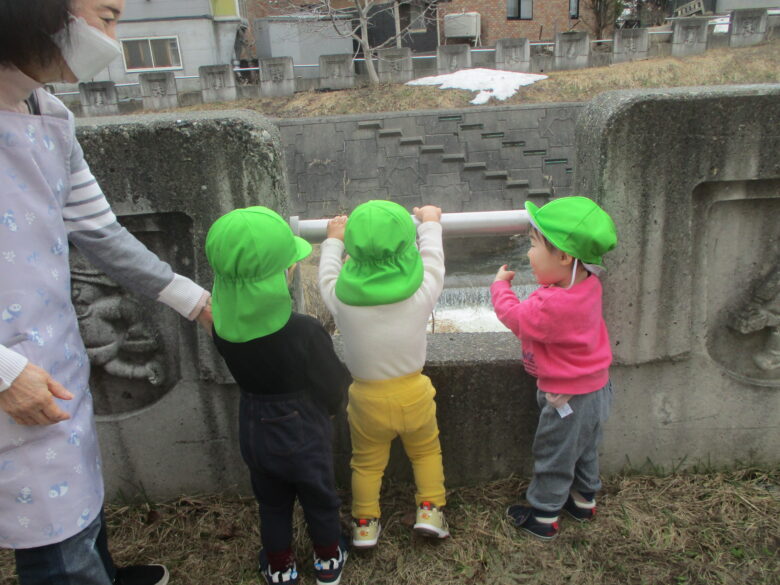 今日のくり組、くるみ組さんはおやき屋さんの裏にある川に行ってきました。