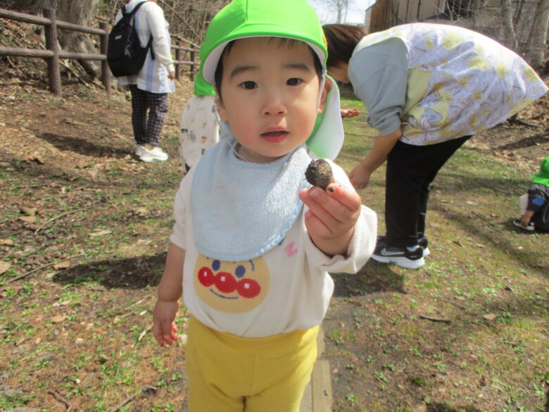 遊歩道に行くとすぐ、木の実を見つけて保育士に見せてくれる姿がありました。