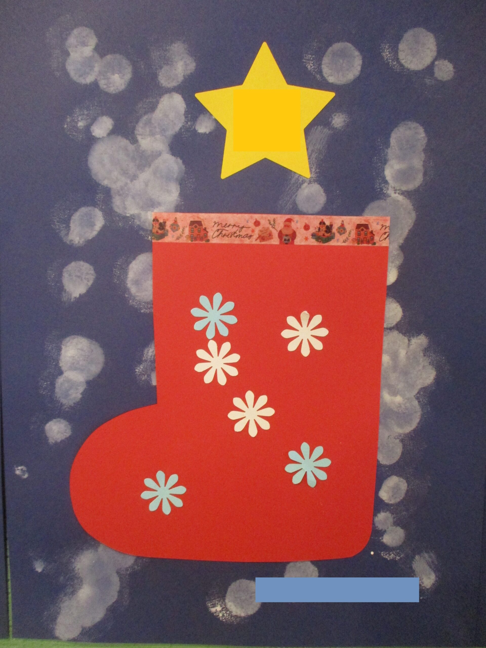 どんぐり組さんはタンポを使って雪を表現しました! あかいくつしたにはお花を貼ってステキなくつしたの完成です☆