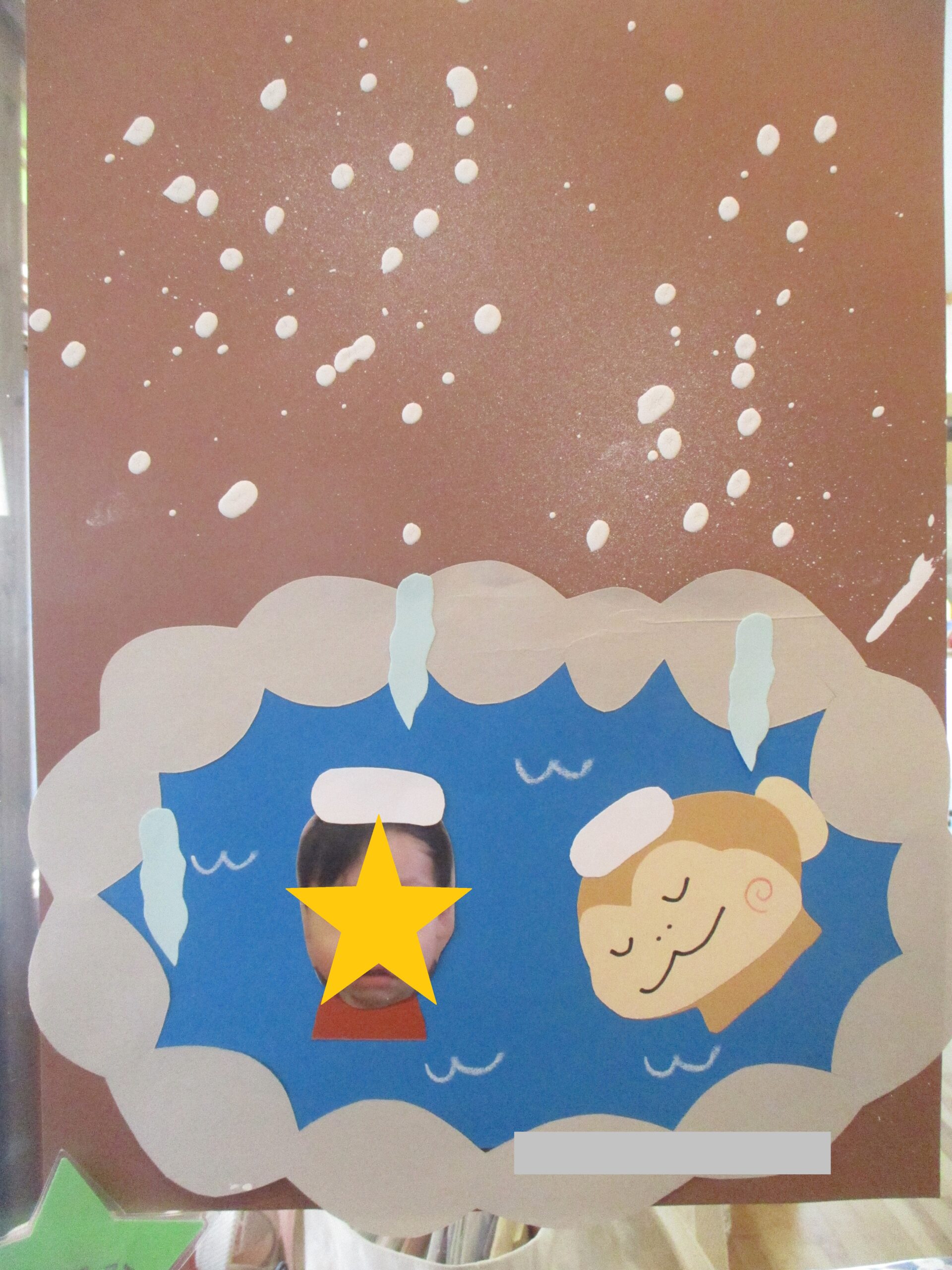 くり組さんは「ふゆといえば」の絵本の1ページを製作で挑戦! ブラシとザルを使って雪を降らせました。