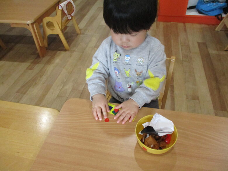 お花紙をクシュクシュ!大きいの作ろう!小さいのにしよう!考えながら楽しく作りました