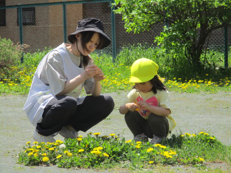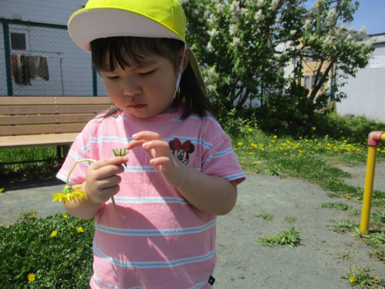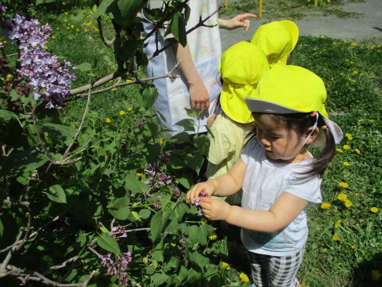 公園では、ライラックやタンポポに触れたり、アリの観察などをして楽しみました。