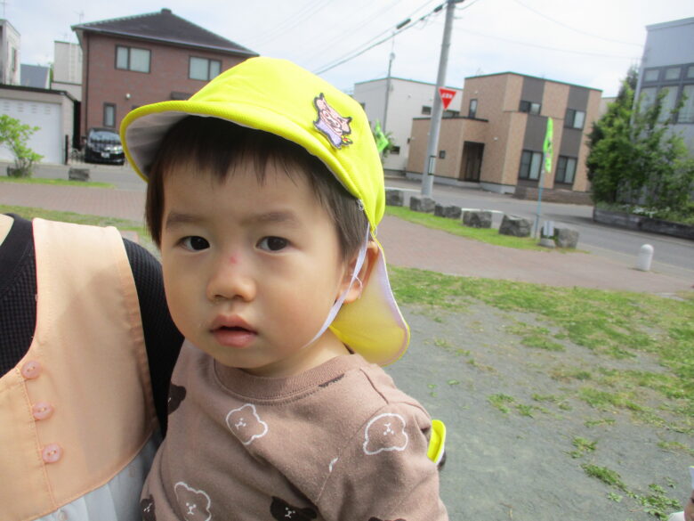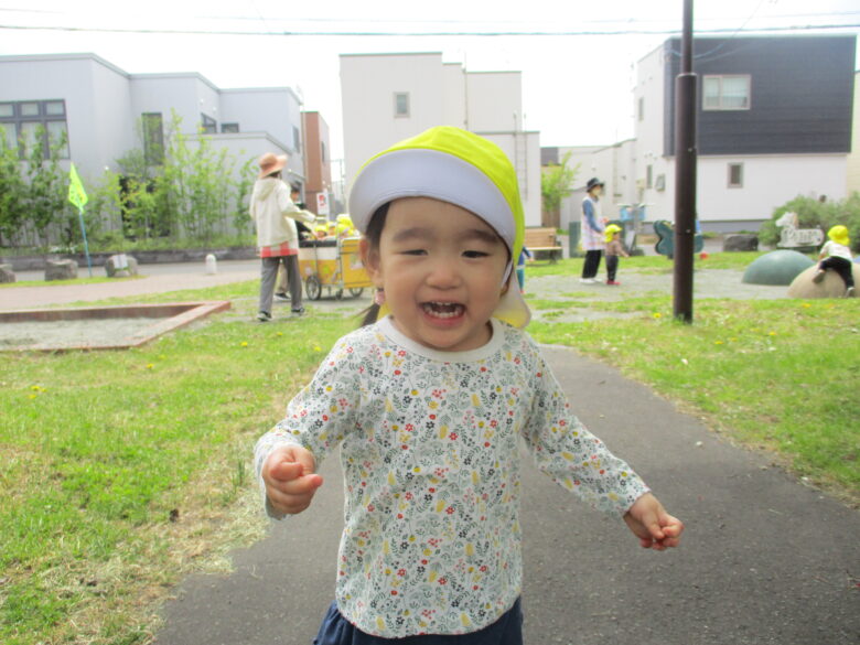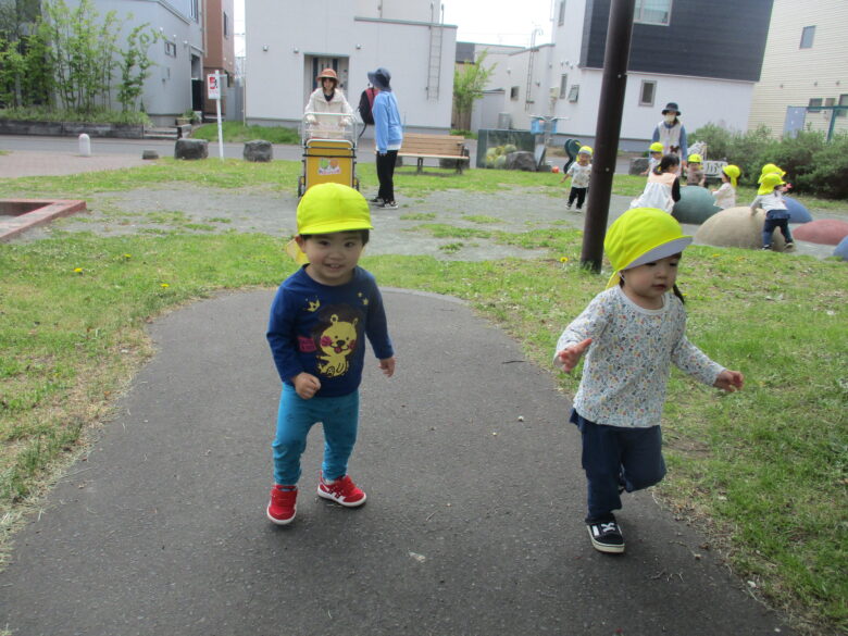 それぞれの歩行の進みで、手を繋いで歩く、友だちと一緒に散歩車に乗る、歩くのが疲れてきたら順番に乗るなど経験をしています。