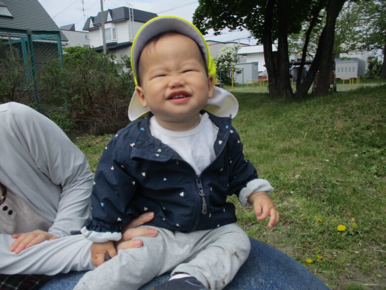 子どもたちの大好きな半球体の遊具では、支えられて座ったり、自分で登ろうとしたり、周りの砂を触ってみたり。