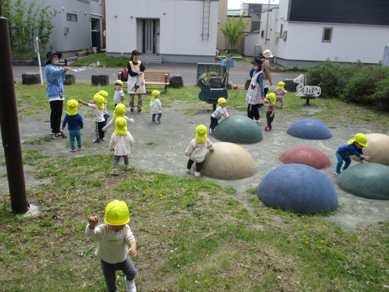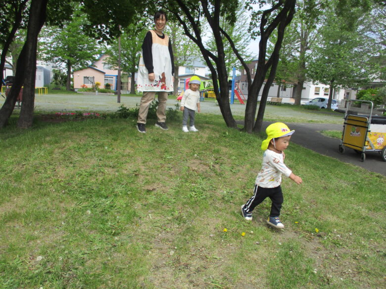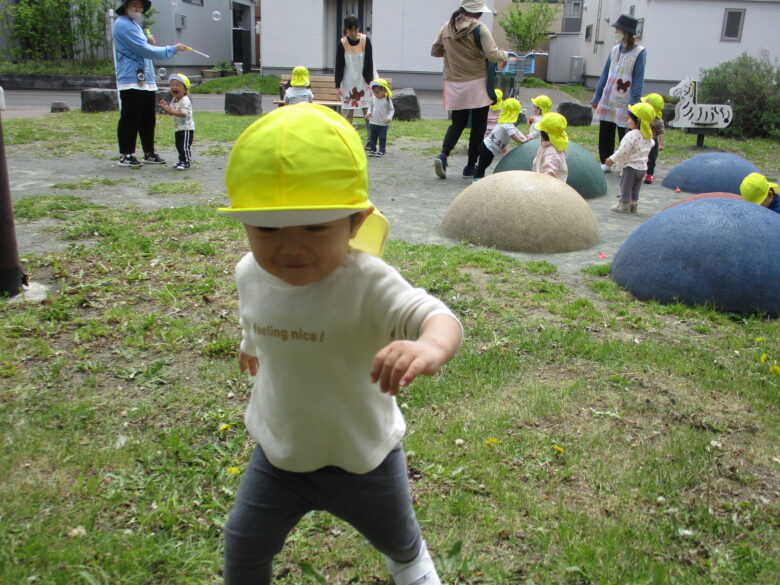 小高い緩やかな斜面を友だちと一緒にバランスを取りながら歩いたり、シャボン玉を追いかけたりと、体をたくさん動かしましたよ。