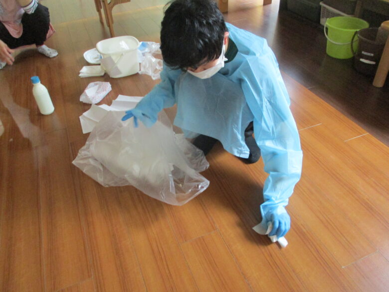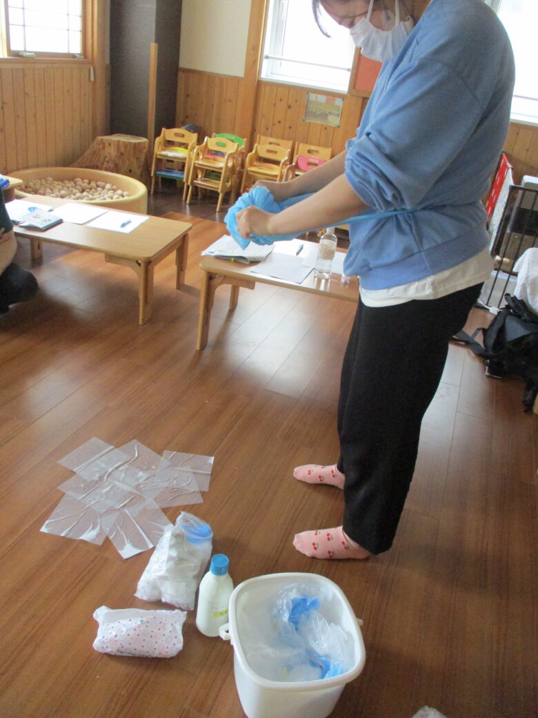 使い捨てエプロンなどの装着と処理後の着脱の仕方など、しっかりと実践することで園内感染拡大を抑えます。