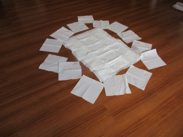 広範囲に広がった吐物を外側から内側へ処理し、次亜塩素酸ナトリウムで10分間消毒の徹底。