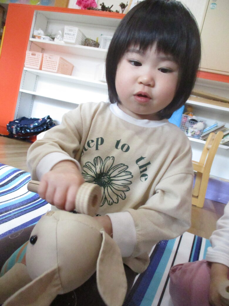 木のおもちゃを歯ブラシに見立ててゴシゴシ😆